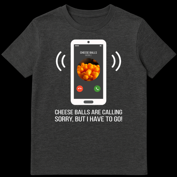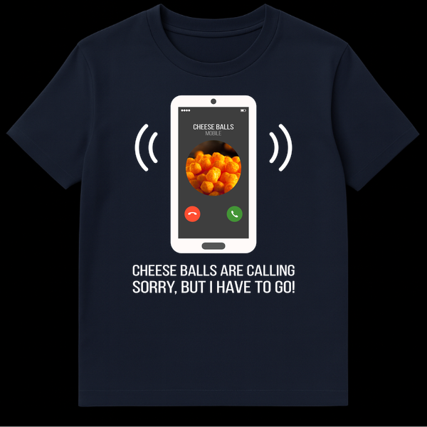 Prioritize your snack cravings with this hilarious “Cheese Balls Are Calling” t-shirt! Featuring a phone screen showing ‘CHEESE BALLS MOBILE’ and the relatable lines ‘SORRY, BUT I HAVE TO GO!’, this design perfectly captures the irresistible pull of your favorite cheesy snack. It’s the ultimate gift for any snack enthusiast who knows what truly matters.