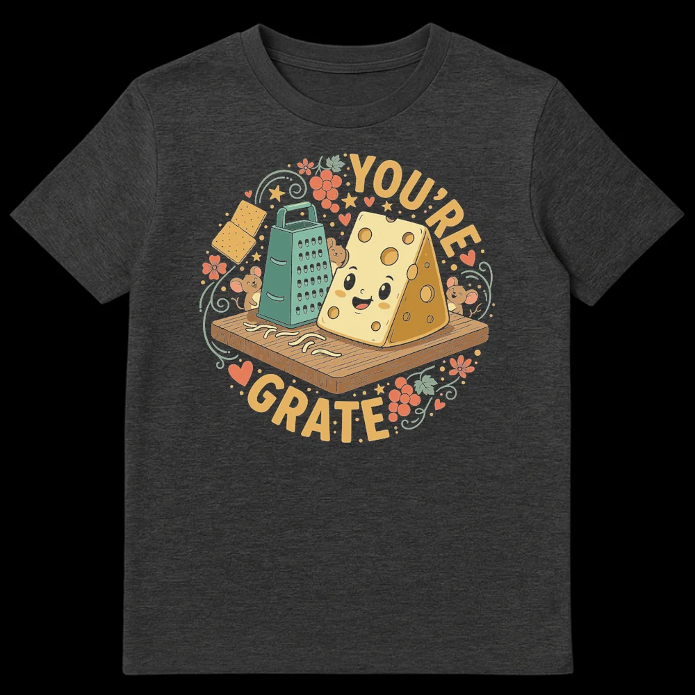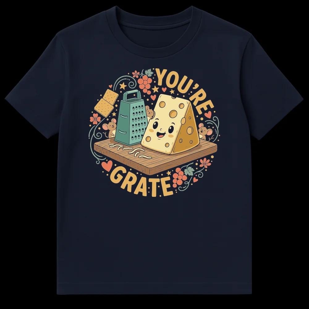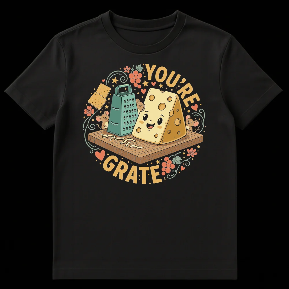 Celebrate the joy of good humor and great food with our delightful “YOU’RE GRATE” t-shirt. This design brilliantly plays on words, pairing the text with a charming, smiling block of cheese and its friendly grater, surrounded by playful mice, grapes, and crackers. Crafted in a whimsical cartoon style with a clean line art aesthetic, it’s a visually appealing and heartwarming way to share a compliment. The cheerful imagery and clever pun make it a perfect conversation starter and a feel-good piece of apparel. Ideal for cheese aficionados, pun enthusiasts, or anyone who appreciates a sweet, positive message. It makes a fantastic gift for birthdays, holidays, or just to tell someone special how much you appreciate them.