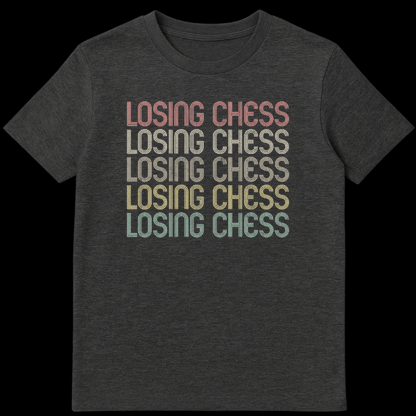 Show off your passion for the classic strategy game with our “LOSING CHESS” t-shirt. This unique design features a striking retro 70s/80s stacked, multi-line font with a cool distressed texture, set in an earthy, muted gradient palette. It’s a fun and self-aware nod to the universal experience of playing chess, especially when the outcomes aren’t always victorious. The repeated text playfully highlights a common frustration, transforming it into a badge of honor and camaraderie among players. Perfect for casual wear or your next chess club meeting, this shirt is a conversation starter for those who appreciate intellectual games and a good sense of humor. It makes an excellent gift for any chess player, from beginners to seasoned strategists, who can laugh at themselves and their game.