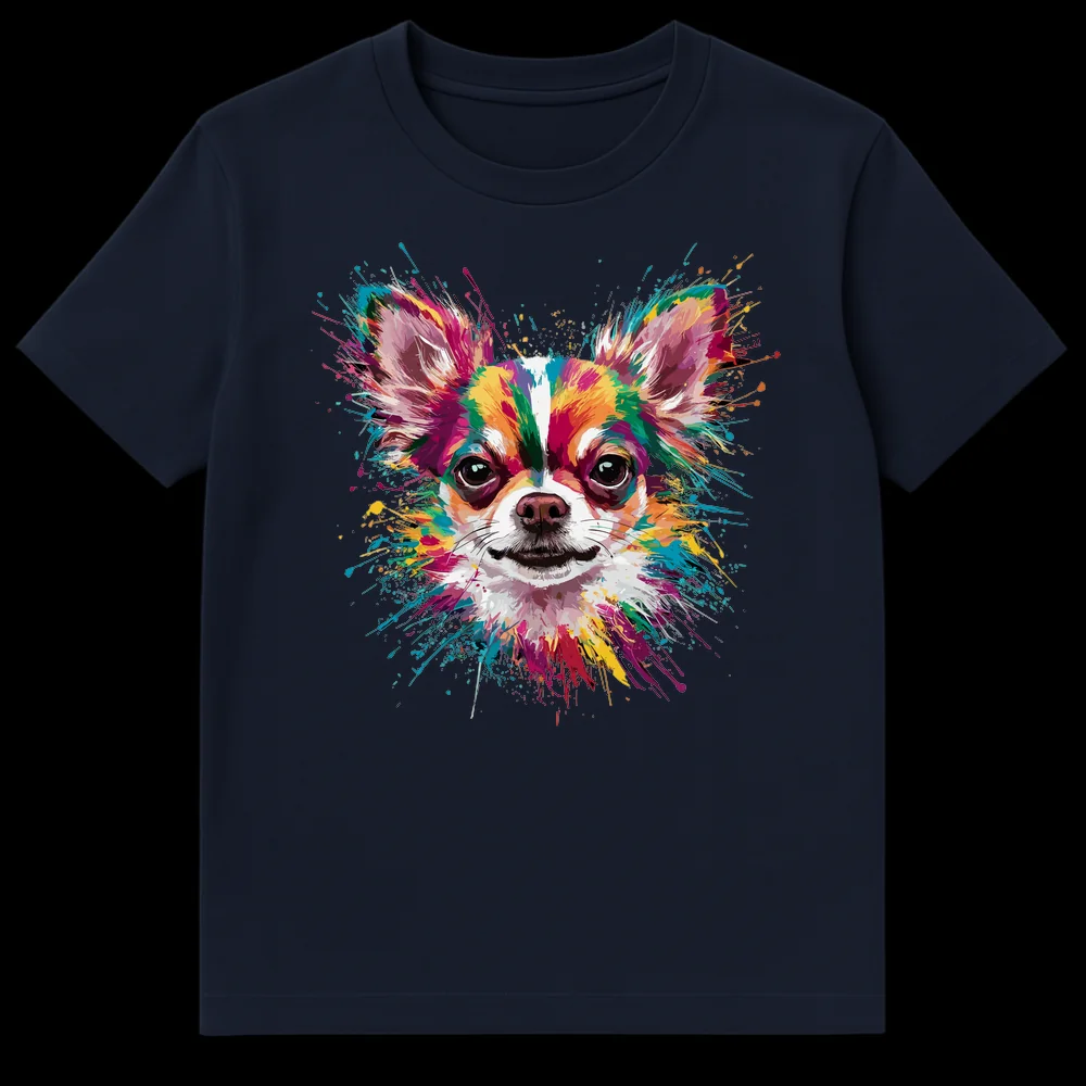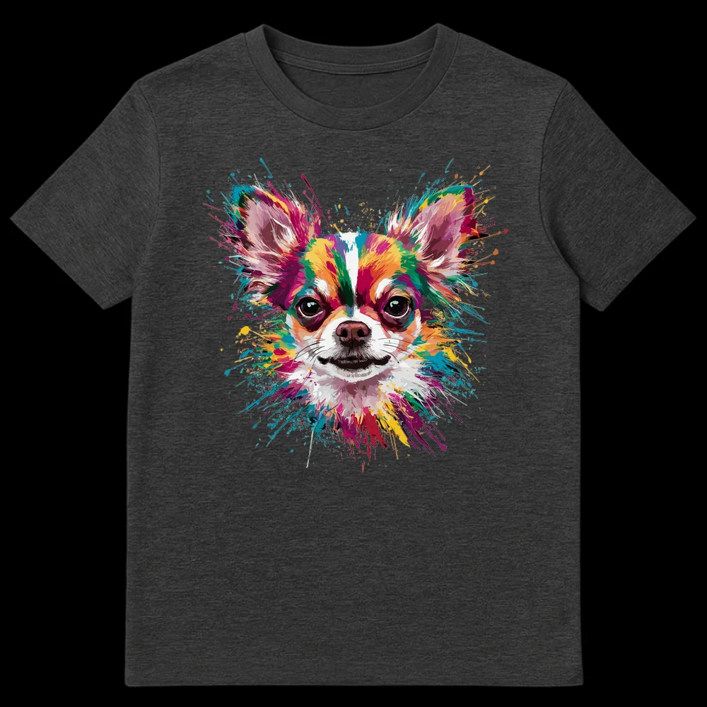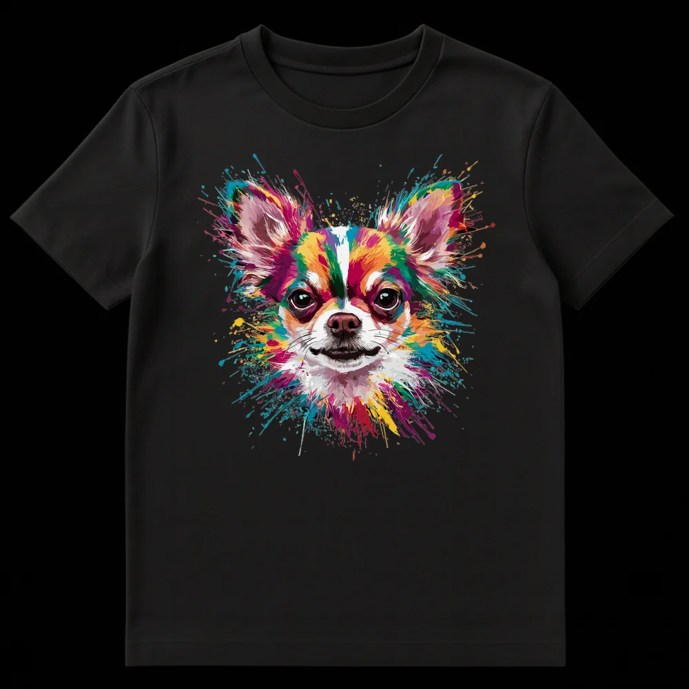 Unleash your vibrant personality with our ‘Colorful Splatter Art Chihuahua’ t-shirt! This isn’t just any dog tee; it’s a dynamic, modern art piece celebrating the beloved long-haired Chihuahua. The design masterfully blends energetic splatter paint and watercolor splash techniques, creating a lively portrait bursting with a rainbow of saturated hues – fuchsias, teals, sunny yellows, and deep purples – all popping brilliantly against a stark black canvas. It captures the spirited essence of a Chihuahua with artistic flair, transforming a pet portrait into a wearable statement. This tee is an absolute must-have for Chihuahua enthusiasts, dog moms, dog dads, or anyone who cherishes colorful, expressive animal art. Make a joyful splash and show off your affection for your furry friend or simply your love for unique, artistic apparel. It’s the ultimate gift for dog lovers who appreciate both style and their canine companions!