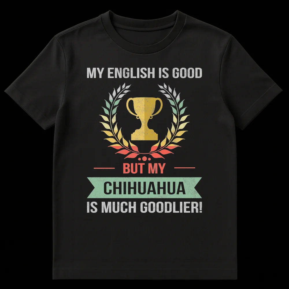 Showcase your unparalleled affection for your furry friend with this uniquely humorous t-shirt! Our “MY ENGLISH IS GOOD BUT MY CHIHUAHUA IS MUCH GOODLIER!” design cleverly plays on comparative adjectives, creating a self-deprecating yet utterly charming declaration of dog devotion. Featuring a vintage-inspired distressed graphic with a trophy and laurel wreath, this shirt perfectly captures the ‘winning’ spirit of having the best Chihuahua. It’s a fantastic conversation starter and a stylish way to express that your pet truly is ‘much goodlier’ than anything else. An absolute must-have for proud Chihuahua owners, dog lovers, and anyone who enjoys a witty, pet-centric joke. This tee makes an excellent birthday gift, holiday present, or a fun personal treat for the devoted pet parent in your life.