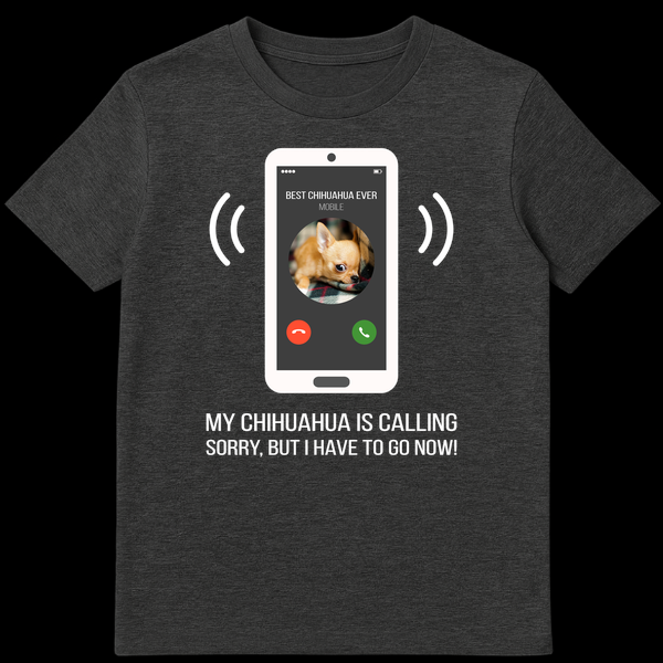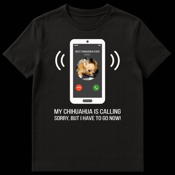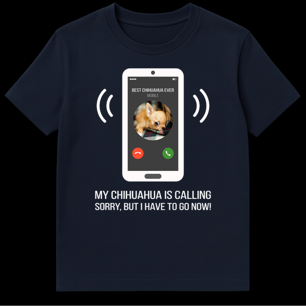 Celebrate your unwavering loyalty to your four-legged best friend with this irresistibly funny t-shirt! The design cleverly depicts a white smartphone receiving an incoming call from ‘BEST CHIHUAHUA EVER,’ complete with a charming puppy photo and classic answer/decline buttons. The bold, all-caps message, ‘MY CHIHUAHUA IS CALLING SORRY, BUT I HAVE TO GO NOW!’, leaves no doubt about your priorities. This tee is more than just clothing; it’s a badge of honor for anyone who puts their chihuahua first. It’s an absolutely perfect gift for birthdays, holidays, or just because, for any chihuahua owner, dog enthusiast, or pet parent who appreciates a good laugh and isn’t afraid to show off their canine devotion. Wear your heart on your sleeve – or rather, your chihuahua’s call on your chest – and share a smile with everyone you meet. It’s comfortable, stylish, and speaks volumes about your love for the cutest dog breed around.