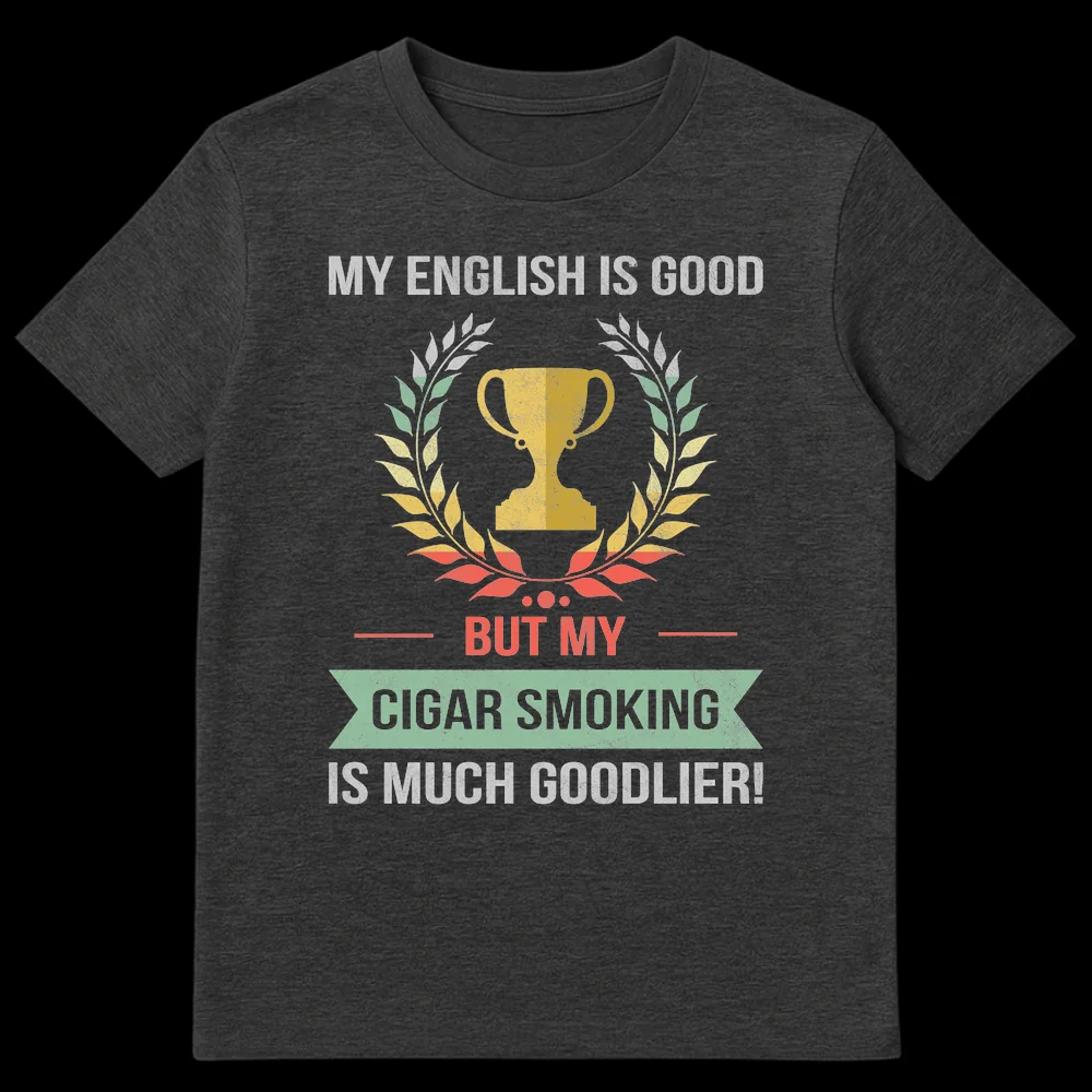 Show off your unique sense of humor and your ultimate passion with this hilarious Cigar Smoker T-Shirt. The standout design features the self-deprecating yet proud statement: “MY ENGLISH IS GOOD BUT MY MY CIGAR SMOKING IS MUCH GOODLIER!” This clever, intentionally incorrect grammar joke is guaranteed to get a chuckle, making it an instant favorite for anyone who appreciates witty wordplay. Adorned with a vintage-style trophy and laurel wreath, this tee subtly declares your mastery in the art of cigar smoking. Crafted for comfort and style, it’s an ideal choice for casual wear, cigar lounge visits, or social gatherings. This Funny Cigar T-Shirt makes an excellent gift for dads, husbands, friends, or any cigar enthusiast in your life who has everything but a shirt that truly speaks to their unique personality and hobby. Embrace the goodlier things in life!