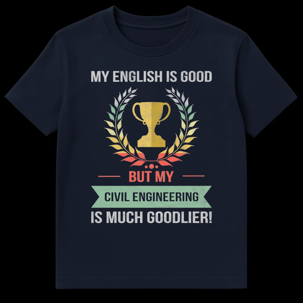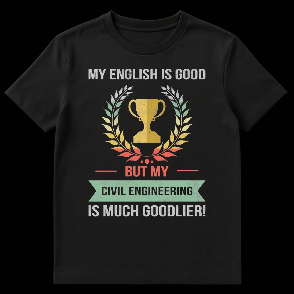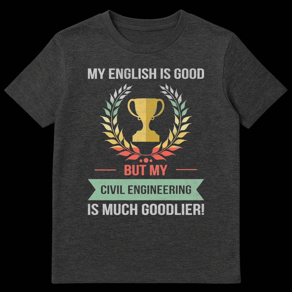 Celebrate your superior technical skills with our humorous “My Civil Engineering Is Much Goodlier!” t-shirt. Featuring a distressed vintage design with a classic trophy and laurel wreath, this shirt proudly displays a witty grammatical twist. It’s the perfect gift for any Civil Engineer, student, or enthusiast who champions their profession with a touch of self-deprecating humor.