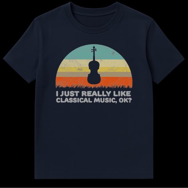 Declare your passion with this unique vintage-style t-shirt featuring a striking violin silhouette against a muted, striped ‘setting sun’ backdrop. The text “I JUST REALLY LIKE CLASSICAL MUSIC, OK?” expresses a relatable, humorous confession for any true classical music enthusiast. This shirt makes a perfect gift for orchestra members, concert-goers, or anyone who deeply appreciates symphonies and melodies.
