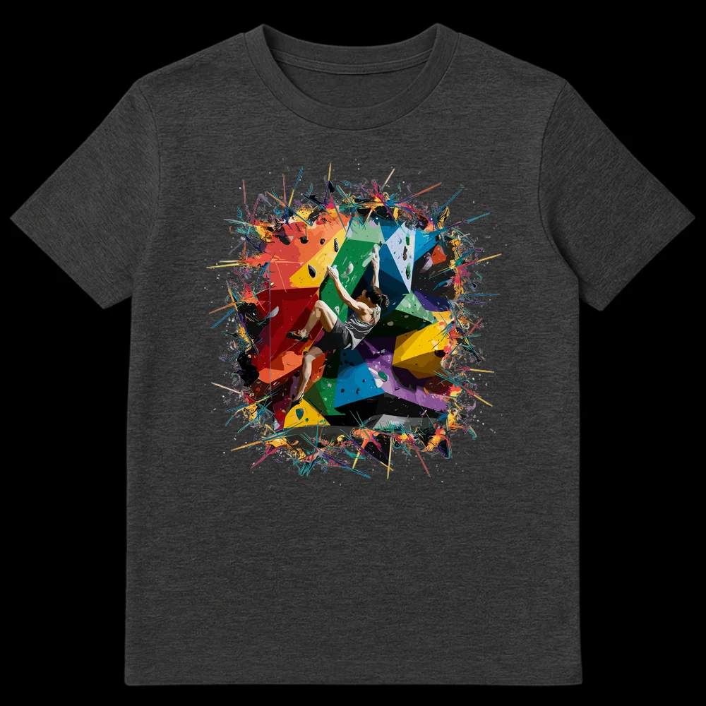 Celebrate the thrill of the ascent with our Rock Climbing Energy Splash T-Shirt. This design vividly captures a climber in action on a vibrant, geometric wall, surrounded by an explosive burst of abstract color. It’s a striking visual homage to the passion and dynamism of bouldering and sport climbing. Perfect for any climbing enthusiast or athlete.