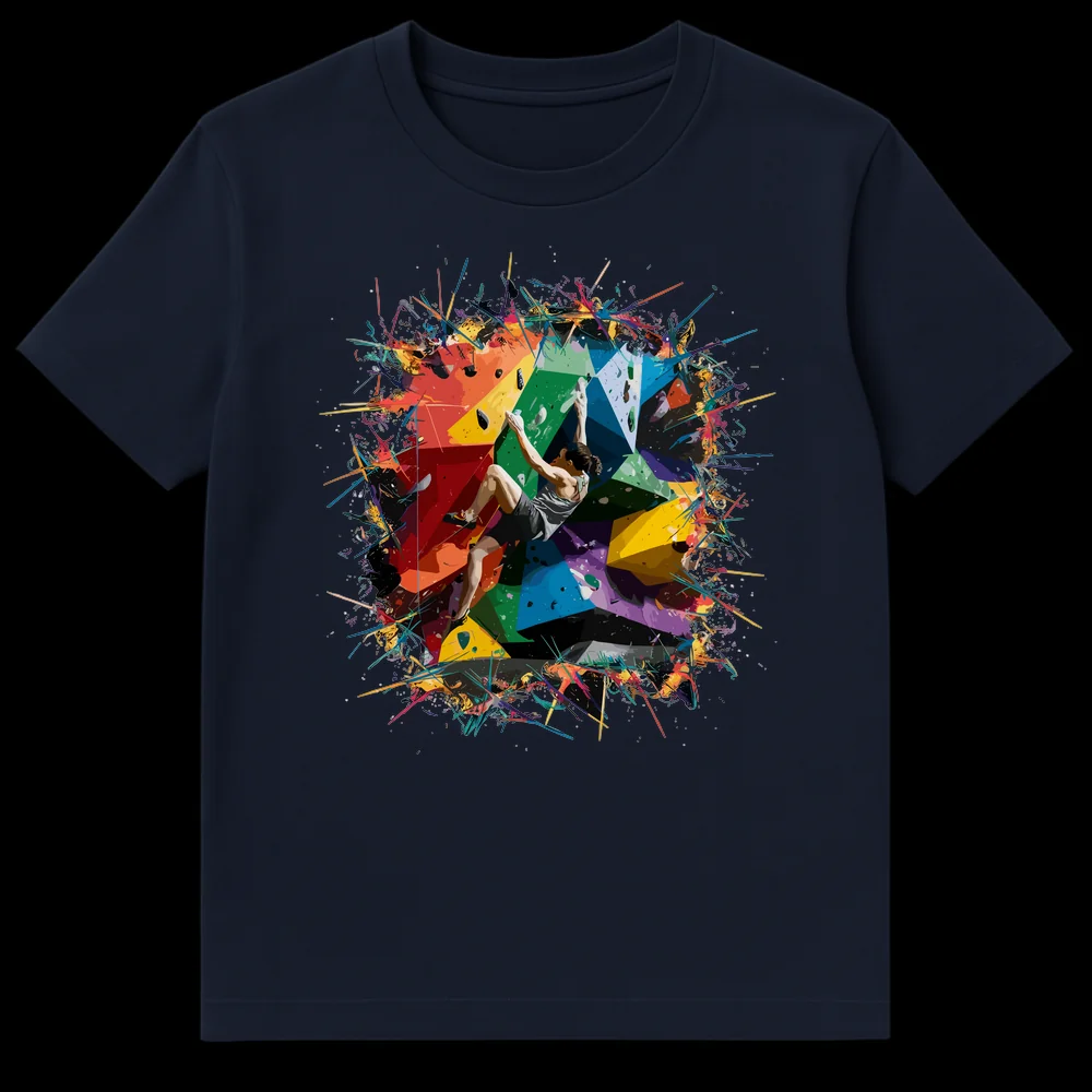 Embrace the dynamic spirit of rock climbing with this unique T-shirt, designed for those who live for the ascent. Featuring a stylized climber mid-action on a vibrant, faceted indoor wall, the design explodes outwards with an energetic splash of abstract colors and lines. It perfectly embodies the intense focus and exhilarating burst of energy required in bouldering and sport climbing. This shirt is more than just apparel; it’s a statement piece, celebrating athleticism and the vibrant climbing community. Ideal for gifting to any passionate climber, bouldering enthusiast, or anyone who appreciates striking, activewear art.