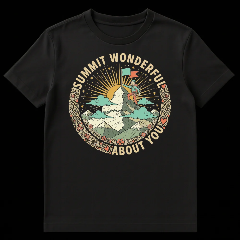 Reach new heights of style and sentiment with our unique “SUMMIT WONDERFUL ABOUT YOU” t-shirt. This design masterfully blends retro outdoor aesthetics with a heartwarming pun, making it a standout piece. The central image depicts a smiling adventurer triumphantly planting flags atop a majestic, snow-capped mountain, framed by an intricate Celtic knot-inspired border with subtle heart and floral accents. It’s a clever phonetic play on “Something wonderful about you,” transforming a classic outdoor scene into a positive affirmation. The muted, earthy color palette of creams, sages, golds, and teals evokes vintage poster art, appealing to nature lovers and optimists alike. This tee isn’t just clothing; it’s an inspirational gift for climbers, hikers, or anyone you admire, conveying warmth and celebration of their wonderful qualities. It’s designed to uplift and inspire, making it a perfect present for friends, family, or your significant other who enjoys the spirit of adventure and a good laugh.