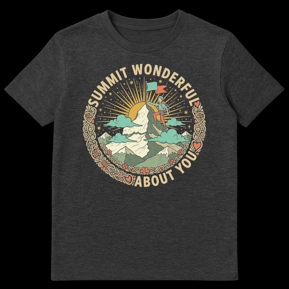 Celebrate the joy of the outdoors with our “SUMMIT WONDERFUL ABOUT YOU” t-shirt. This design brilliantly plays on words, featuring a cheerful climber reaching a mountain summit, symbolizing achievement and a heartfelt compliment. Perfect for anyone who loves hiking, adventure, or appreciates a clever, uplifting message.