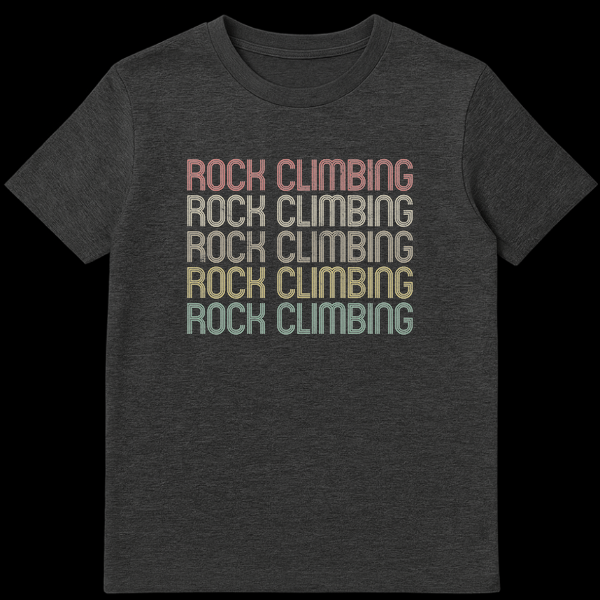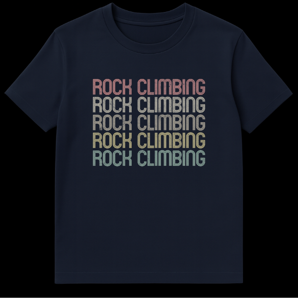Declare your passion with our Rock Climbing Vintage T-Shirt. Featuring the phrase ‘ROCK CLIMBING’ repeated five times in a retro 70s/80s striped font with a distressed texture and muted earthy colors, this design is a straightforward celebration of the sport. It’s the perfect gift for climbers who love classic aesthetics and want to express their dedication.