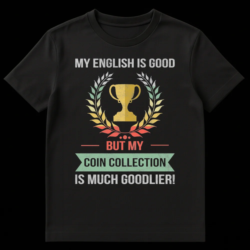 Celebrate your love for numismatics with our exclusive “My English Is Good But My Coin Collection Is Much Goodlier!” t-shirt. This design playfully combines a deliberate grammar joke with a boastful pun, perfect for any coin enthusiast. Featuring a distressed retro aesthetic with a prominent trophy and laurel wreath, it symbolizes the ultimate achievement in coin collecting. The muted, earthy color palette on a solid black background gives it a stylish vintage feel, making it more than just a shirt—it’s a statement. Wear your hobby with pride and spark conversations among fellow collectors. An unforgettable gift for birthdays, holidays, or any special occasion for coin collectors, numismatists, or anyone who appreciates clever, niche humor.