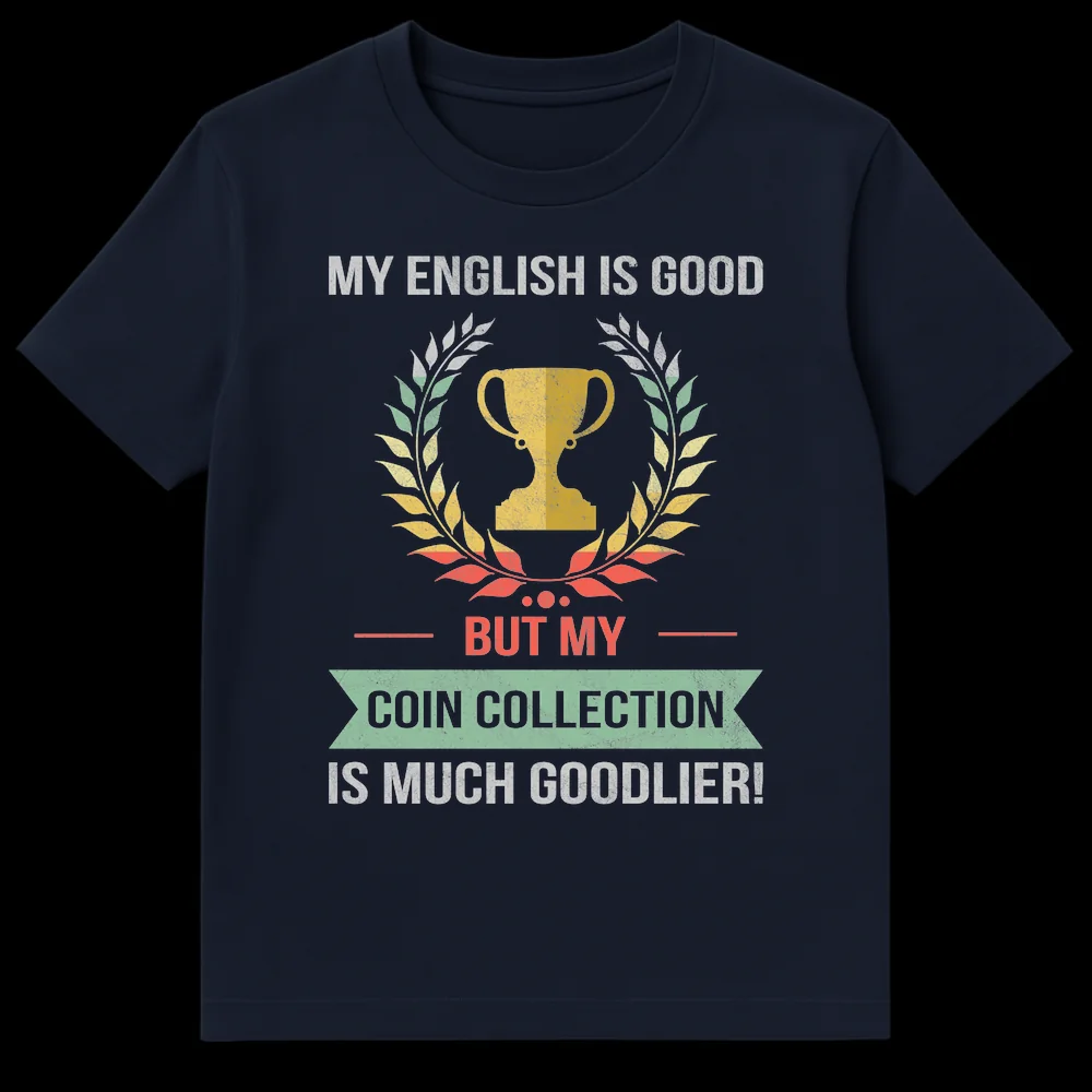 Show off your passion for numismatics with our “My Coin Collection Is Much Goodlier!” T-shirt. This distressed retro design features a trophy and laurel wreath, celebrating the collector’s pride with a clever, self-aware grammar pun. Perfect for coin enthusiasts who love a good laugh and want to proudly display their unique hobby. It’s an ideal gift for any dedicated coin collector in your life.
