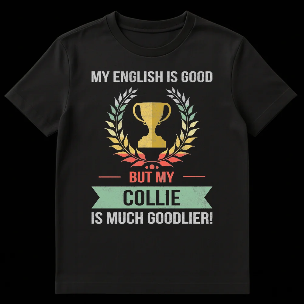 Celebrate your deep affection for your furry friend with this hilarious “MY ENGLISH IS GOOD BUT MY COLLIE IS MUCH GOODLIER!” t-shirt. This design playfully asserts a dog owner’s pride, using a charmingly incorrect ‘goodlier’ for a chuckle. Featuring a vintage trophy graphic, it’s the perfect gift for Collie lovers and anyone who appreciates wholesome pet humor.