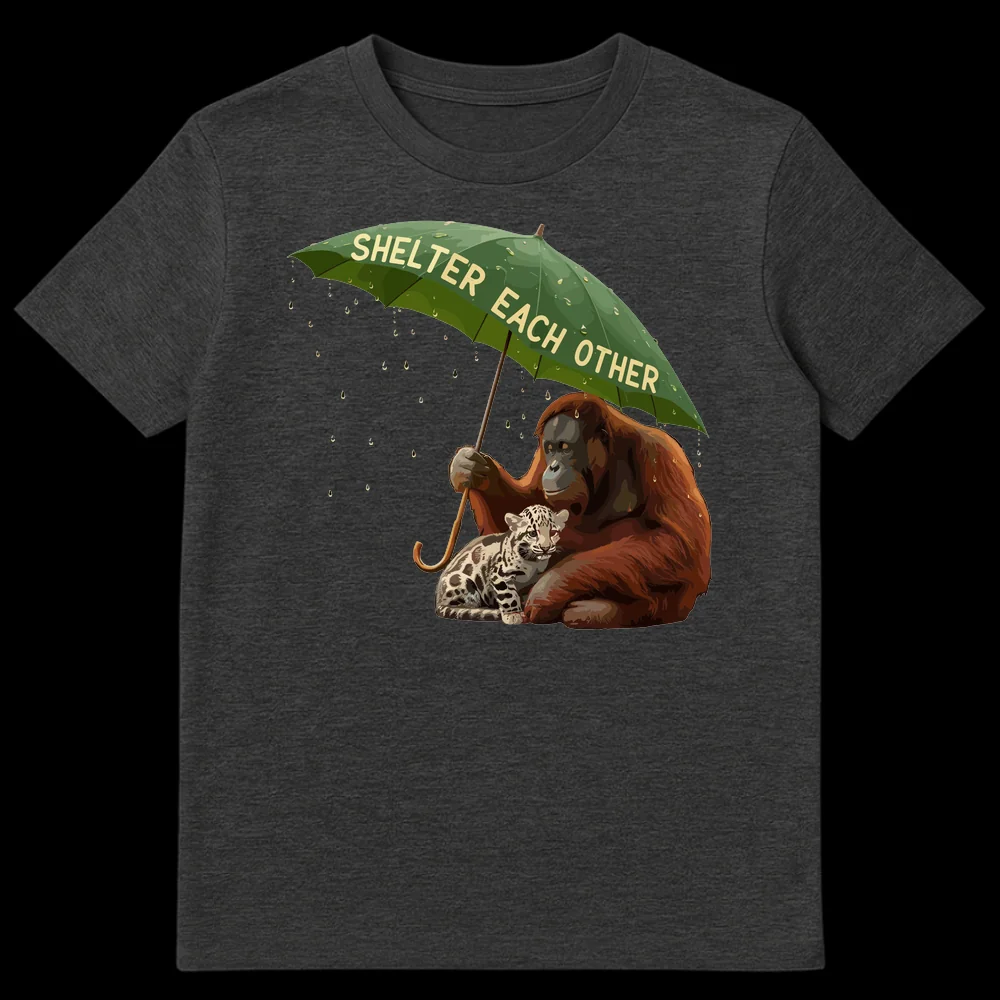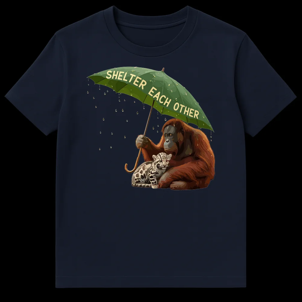 Embrace empathy with our unique ‘Shelter Each Other’ t-shirt, featuring a protective orangutan shielding a clouded leopard under an umbrella. This design beautifully illustrates compassion and the urgent need for wildlife protection. It’s a perfect gift for animal lovers, conservationists, or anyone passionate about environmental awareness and interspecies bonds.