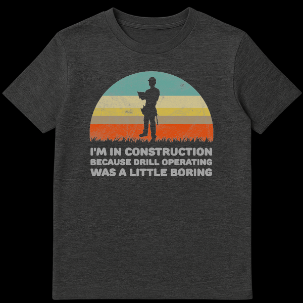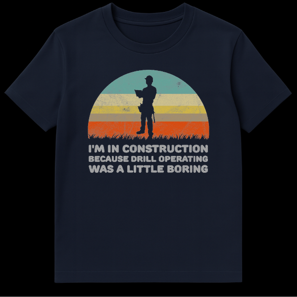 Embrace the lighter side of the job with our witty “I’M IN CONSTRUCTION BECAUSE DRILL OPERATING WAS A LITTLE BORING” t-shirt. This design brilliantly plays on words, making a humorous statement about the switch from repetitive tasks to the dynamic world of construction. It’s a perfect conversation starter and an ideal gift for any construction worker or former drill operator who appreciates a good pun and a bit of workplace humor.