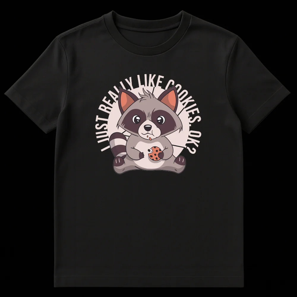 Declare your love for sweet treats with this adorable Raccoon Lover T-Shirt! Featuring a cute, anthropomorphized raccoon clutching a chocolate chip cookie with the relatable phrase, “I JUST REALLY LIKE COOKIES, OK?” This design perfectly captures the joy of indulging in your favorite snack, making it a charming and humorous statement piece for anyone with a sweet tooth. It’s an ideal gift for animal lovers, cookie enthusiasts, or anyone who appreciates playful, cute graphic tees.