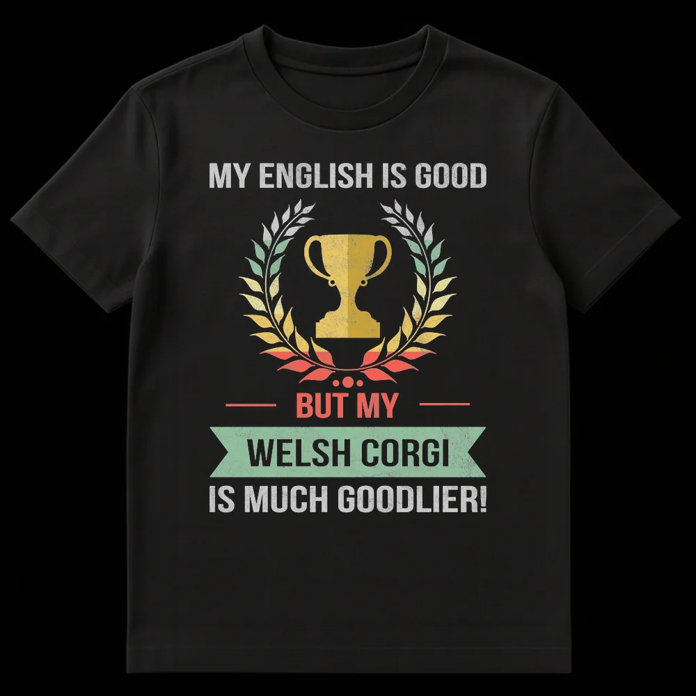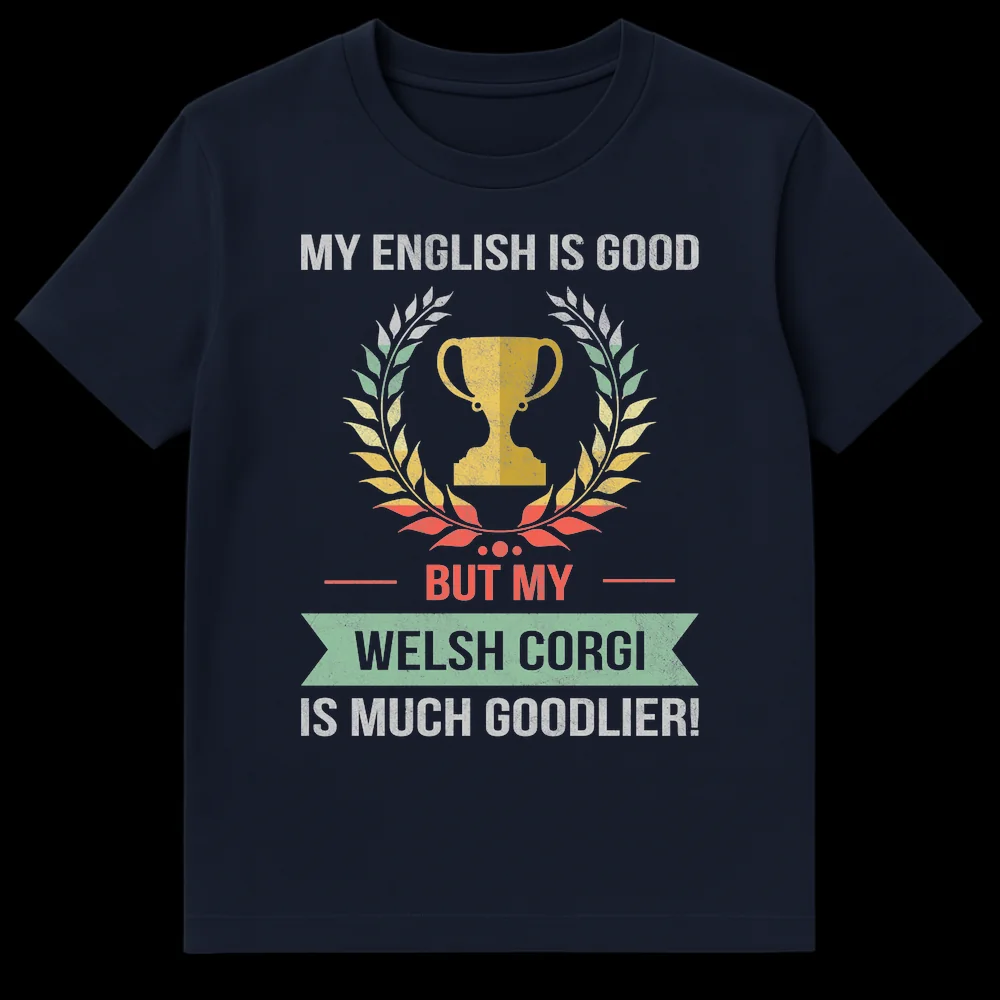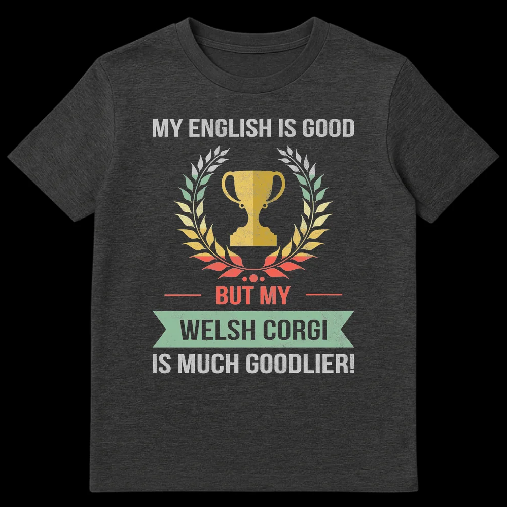 Show off your unparalleled love for your furry friend with our unique Welsh Corgi t-shirt! This design proudly declares, “MY ENGLISH IS GOOD BUT MY WELSH CORGI IS MUCH GOODLIER!”, a delightful and self-deprecating linguistic pun that perfectly captures the extreme affection Corgi owners feel. The humor lies in the exaggerated (and grammatically incorrect) superlative, signifying that your Corgi’s ‘goodness’ transcends all rules. Adorned with a stylized trophy and laurel wreath, this shirt celebrates your pet as a true champion. It’s an ideal humorous gift for Corgi moms, dads, or any dog lover who cherishes their companion above all else.