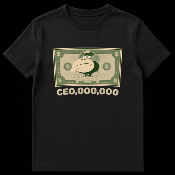 Lampoon executive compensation with our “CEO,000,000” t-shirt, featuring a grumpy cartoon monkey in a currency bill design. This clever pun, sounding like “CEO, millions,” pokes fun at excessive corporate salaries and the absurdity of ‘monkey business’ in leadership. It’s the perfect gift for cynical business professionals or anyone who appreciates sharp corporate satire.
