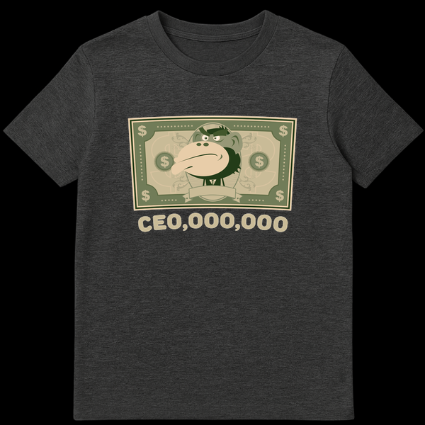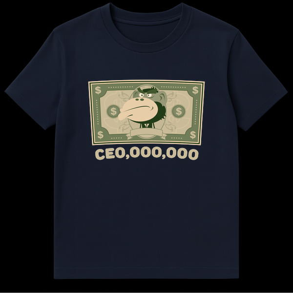 Make a statement without saying a word with our unique “CEO,000,000” t-shirt, a brilliant piece of corporate satire. This design cleverly merges a modern cartoon monkey, styled within an iconic currency bill, with a witty phonetic pun on executive pay. The text “CEO,000,000” instantly evokes “CEO, millions,” highlighting the often-astronomical salaries of top executives and the ironic notion of ‘monkey business’ at the highest levels. Crafted for comfort, this tee is more than just clothing; it’s a conversation starter, a subtle protest, and a declaration of your discerning humor. Perfect for finance professionals, entrepreneurs, or anyone with a critical eye on corporate culture, it’s an ideal gift for those who appreciate smart, satirical commentary.