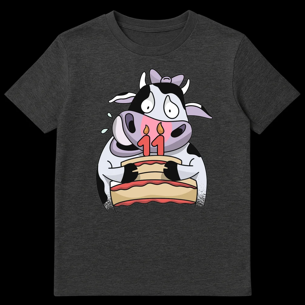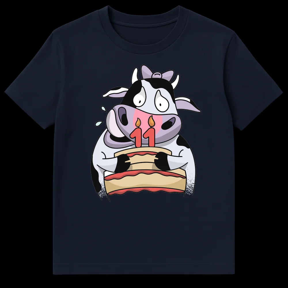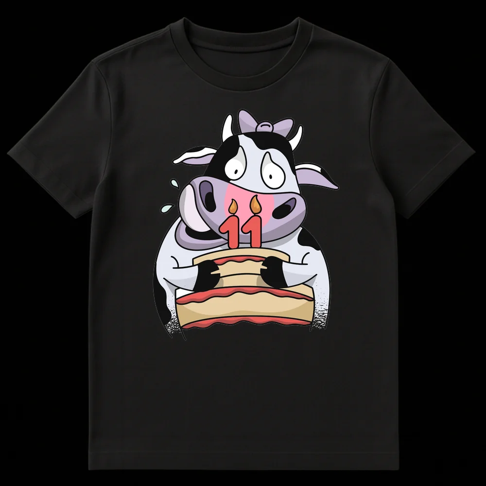Make their 11th birthday extra special with this delightfully charming t-shirt, a perfect blend of cuteness and celebratory fun. The design showcases a beloved cartoon Holstein cow, complete with her signature black and white spots, holding a festive two-layer birthday cake adorned with candles forming the number “11”. Her wide, slightly overwhelmed eyes and happy ‘tears’ add a touch of relatable humor, making her an endearing birthday icon. This design masterfully plays on the classic “Moo is 11” pun, making it a wholesome and memorable way to mark this milestone. The bright color palette and clean, illustrative style ensure it stands out. Crafted for comfort and style, this tee is an ideal gift for 11-year-olds, children, or anyone who appreciates cute animal cartoons, gentle humor, and farm animal charm. It’s a fun, cheerful, and heartwarming present that’s sure to bring smiles and make any 11th birthday celebration moo-velous!