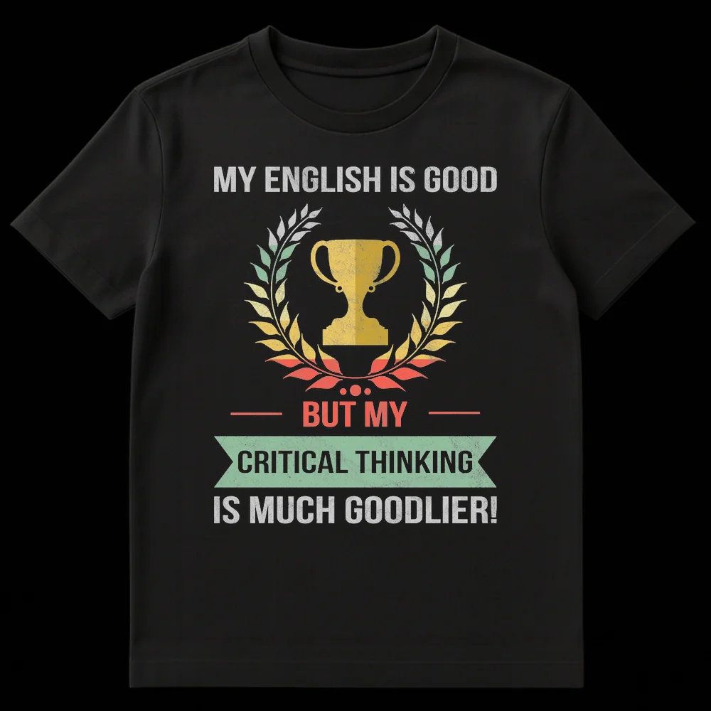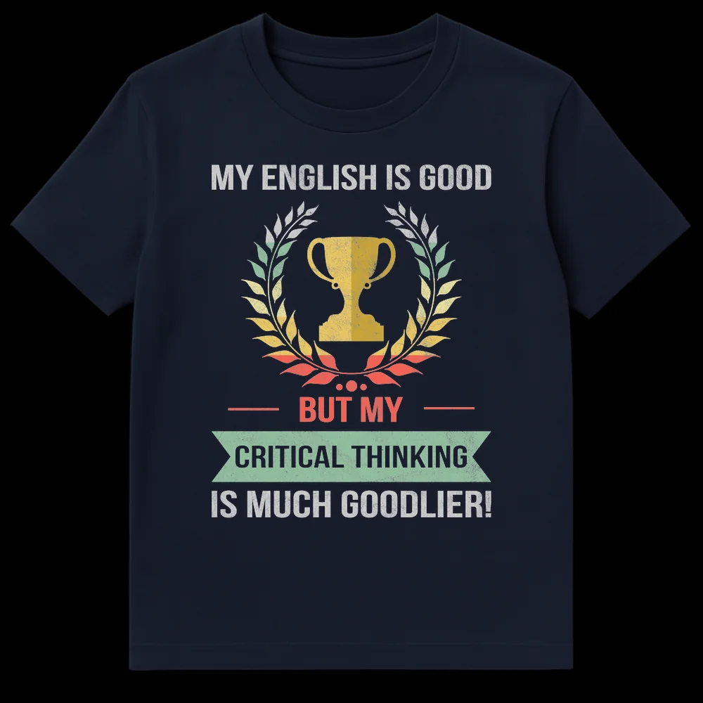 Unleash your inner wordsmith and critical mind with our “MY ENGLISH IS GOOD BUT MY CRITICAL THINKING IS MUCH GOODLIER!” t-shirt. This design celebrates intellectual prowess with a clever, intentionally incorrect superlative that highlights superior critical thinking over rigid grammatical rules. The vintage-inspired trophy and laurel wreath graphics, paired with distressed retro typography, evoke a timeless academic charm. It’s a subtle yet impactful way to showcase your sharp wit and playful personality. Perfect for college students, professors, writers, or anyone who loves a good linguistic challenge and a dash of irony. This shirt isn’t just clothing; it’s a conversation starter and a humorous badge of intellectual honor.