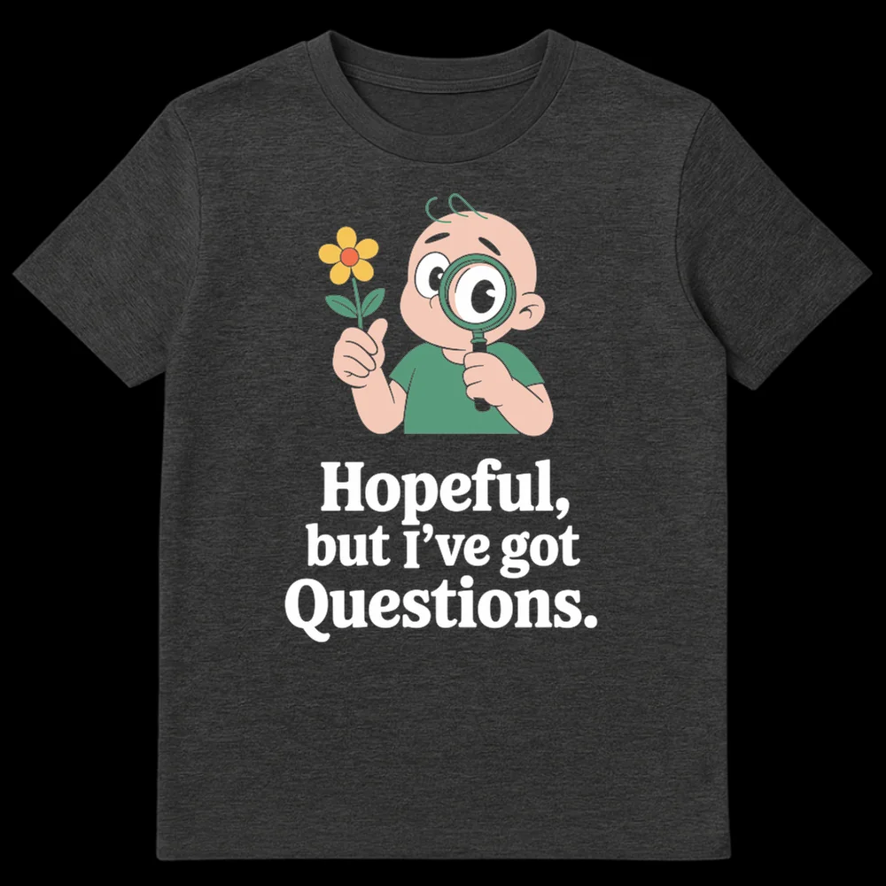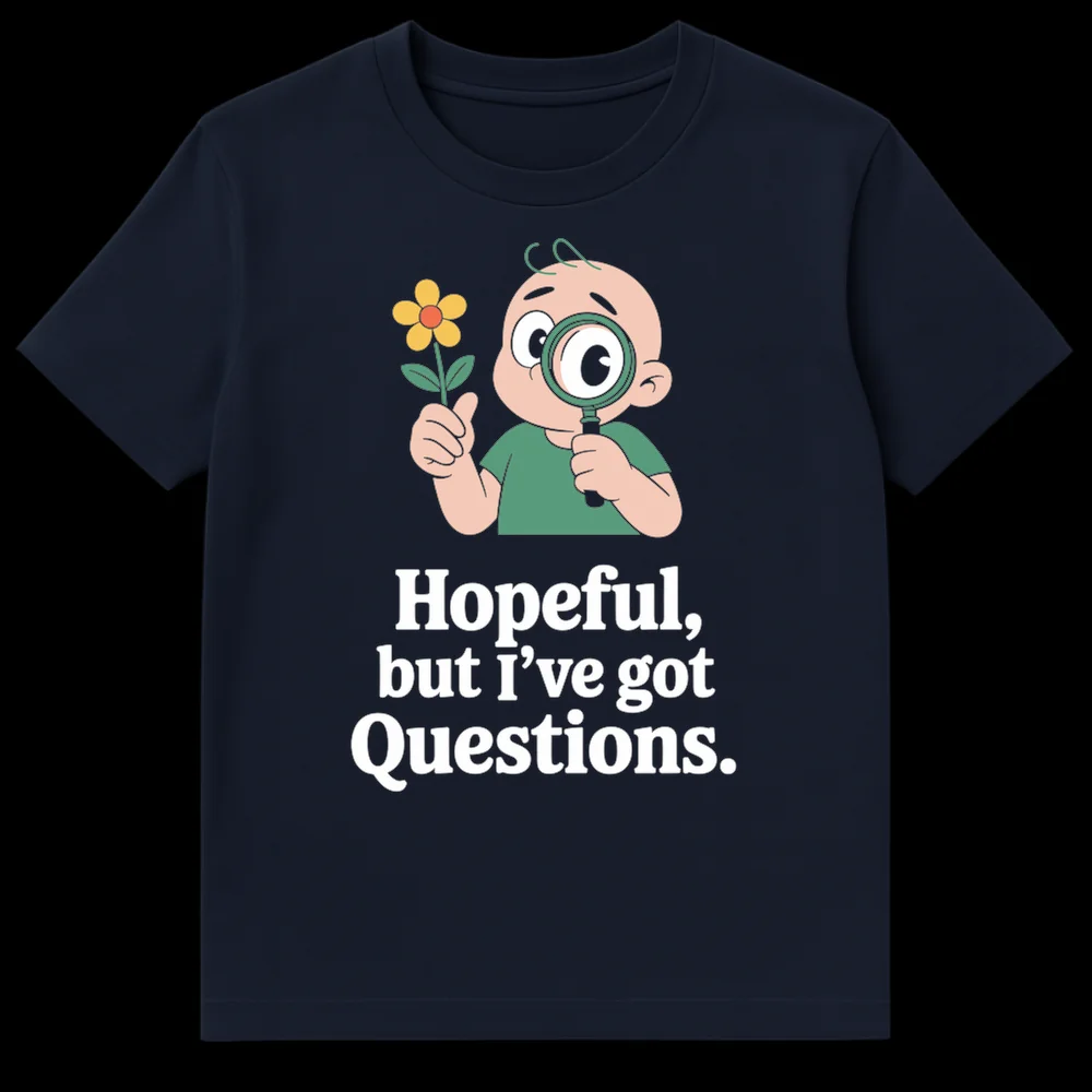 Embrace your inner ‘skeptical optimist’ with this witty t-shirt featuring a curious child examining a flower with a magnifying glass. The text “Hopeful, but I’ve got Questions.” perfectly captures the spirit of inquiry and pragmatic optimism. It’s a fantastic gift for critical thinkers, academics, scientists, or anyone who loves to dig deeper and question the status quo.