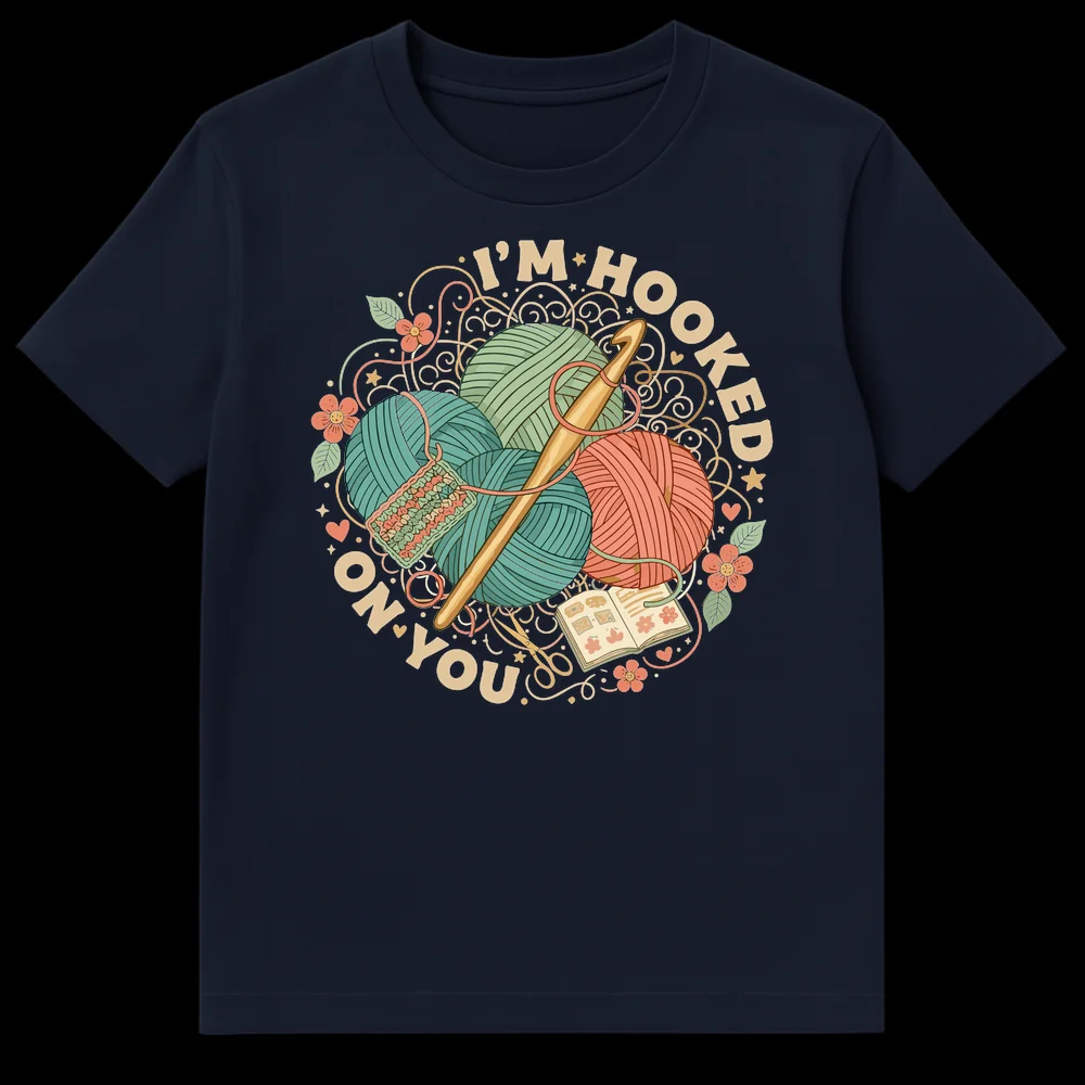 Declare your love with this charming “I’M HOOKED ON YOU” t-shirt, featuring whimsical crochet art. This design cleverly combines the literal act of crocheting with a sweet declaration of affection, making it a unique expression for any fiber artist. It’s the perfect gift for crochet lovers, knitting enthusiasts, or anyone who appreciates a heartfelt crafting pun.