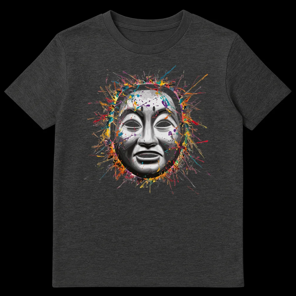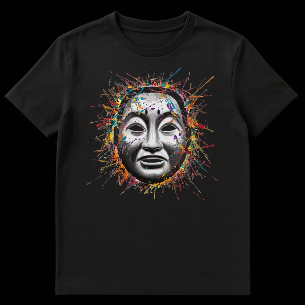 Embrace deep cultural symbolism with this striking Japanese mask t-shirt, featuring a serene grayscale Noh-style mask enveloped by an explosion of vibrant, abstract paint splatters. This design beautifully contrasts ancient wisdom with modern expressive art, creating a unique statement piece. Perfect for art lovers and cultural enthusiasts who appreciate profound aesthetic fusions.