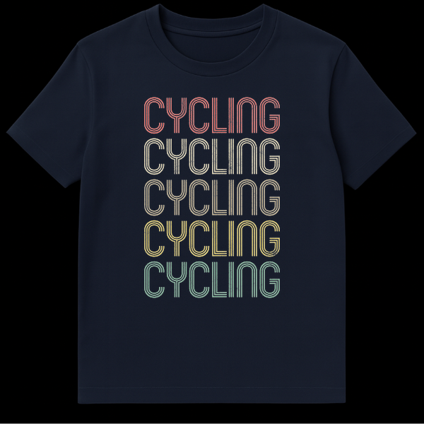Gear up in style with this unique “CYCLING” themed t-shirt, perfect for any devoted cyclist. The design showcases the word “CYCLING” repeated vertically five times, each instance rendered in a distinct, muted color palette from reddish-orange to teal. The letters feature a bold, sans-serif font created with parallel lines, giving it a cool retro vibe, further enhanced by a distressed, grunge texture that suggests a well-loved, vintage piece. This shirt isn’t just clothing; it’s a statement of dedication to two-wheeled adventures. It captures the spirit of cycling culture with an aged, authentic look that stands out from typical sportswear. Whether you’re hitting the trails, cruising city streets, or just dreaming of your next ride, this tee is a comfortable and stylish choice. It makes an excellent gift for men and women who live and breathe cycling, offering a blend of nostalgic charm and active lifestyle appeal.