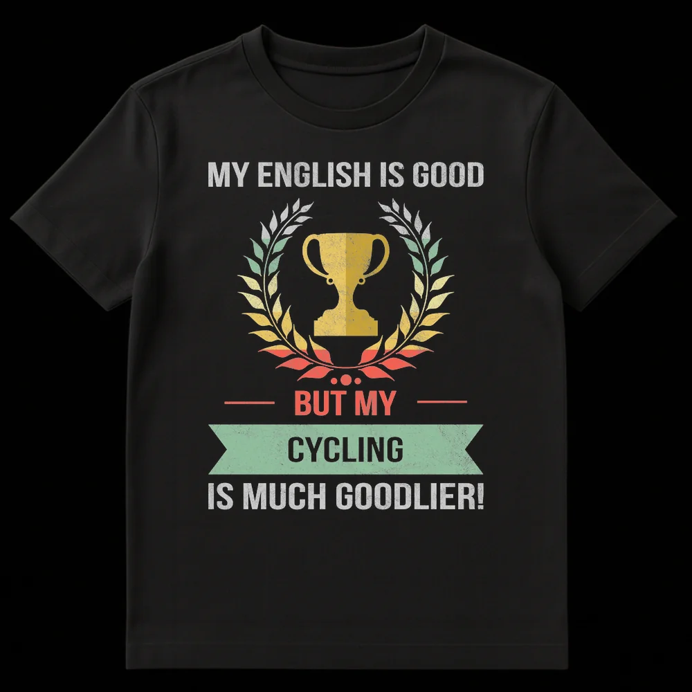 Show off your love for cycling with this uniquely humorous t-shirt! Featuring the self-aware and witty slogan “MY ENGLISH IS GOOD BUT MY CYCLING IS MUCH GOODLIER!”, this design celebrates the sheer joy of biking with a playful grammatical twist. The distressed, vintage-inspired graphics, including a triumphant trophy and laurel wreath, perfectly complement the tongue-in-cheek message. It’s an ideal conversation starter that resonates with anyone who prioritizes their pedal power over perfect prose. Gift this tee to the passionate cyclist in your life, a dad who loves a good joke, or anyone who finds humor in their devotion to the open road. It’s more than just a shirt; it’s a statement of humorous pride in your favorite sport!