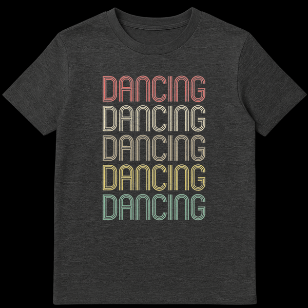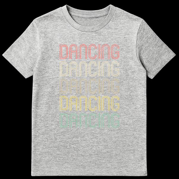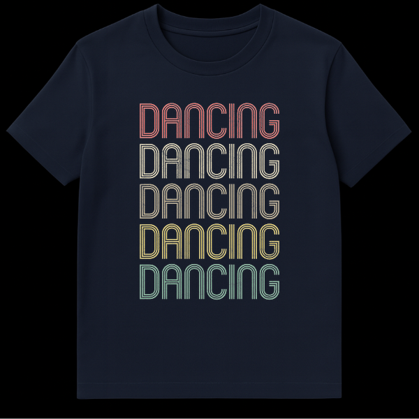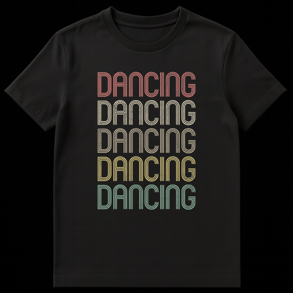Step onto the dance floor in style with this iconic “DANCING” t-shirt. Featuring the word repeated five times in a captivating retro, distressed font with a vibrant gradient of warm to cool colors, this design evokes a classic disco or 70s/80s aesthetic. It’s the perfect statement piece for anyone who loves to move, making it an excellent gift for dance enthusiasts, party-goers, or vintage style lovers.