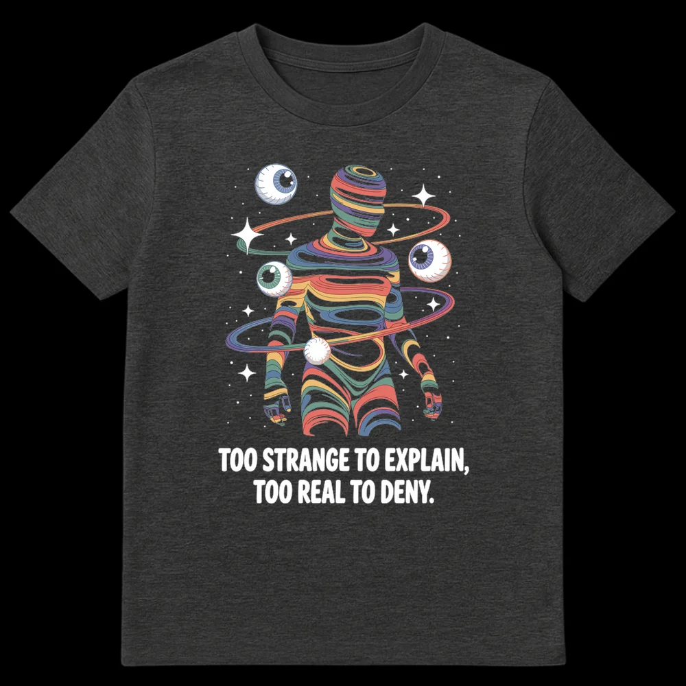 Embrace the unknown with our ‘Too Strange To Explain, Too Real To Deny’ tee, featuring a vibrant, neo-psychedelic cosmic design. This abstract human form surrounded by floating eyeballs and orbital rings captures the essence of existential wonder. It’s the perfect statement piece for those who appreciate profound concepts and unique art, making it an ideal gift for mystics, philosophers, and sci-fi fans.