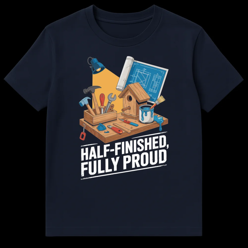 Embrace the joy of creation with our “HALF-FINISHED, FULLY PROUD” t-shirt, celebrating every DIY project, no matter its stage. This design features a detailed workbench scene with tools and a birdhouse, perfect for those who appreciate the process over perfection. It’s a humorous and relatable statement for anyone who loves crafting or woodworking. A fantastic gift for the hobbyist, crafter, or home improvement enthusiast in your life.