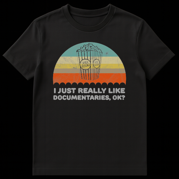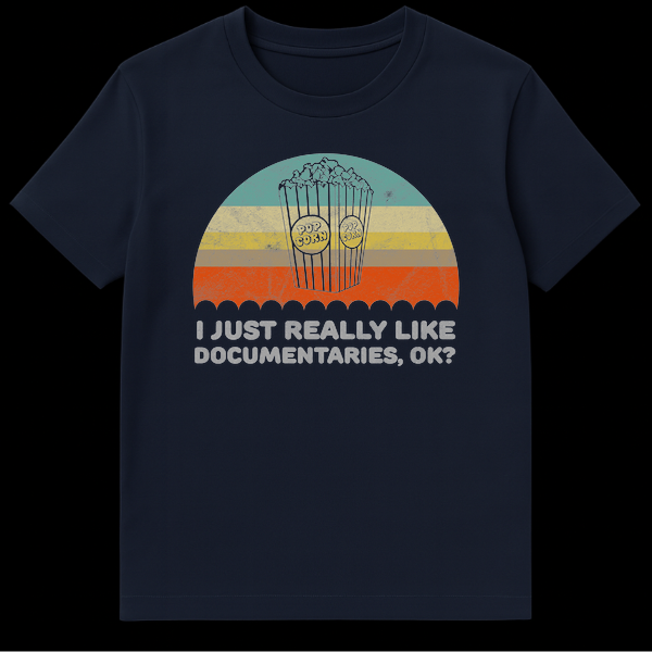 Embrace your non-fiction passion with this quirky, vintage-style t-shirt. Featuring a distressed retro sunset graphic, a black outline popcorn box, and the relatable phrase, “I JUST REALLY LIKE DOCUMENTARIES, OK?” This design perfectly captures the humor of dedicated film lovers. It’s an ideal gift for anyone who prefers real-life stories over fiction.