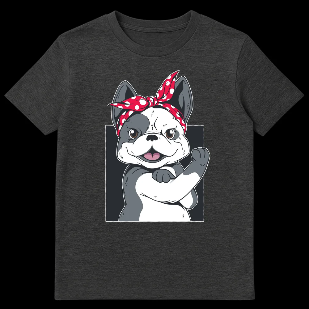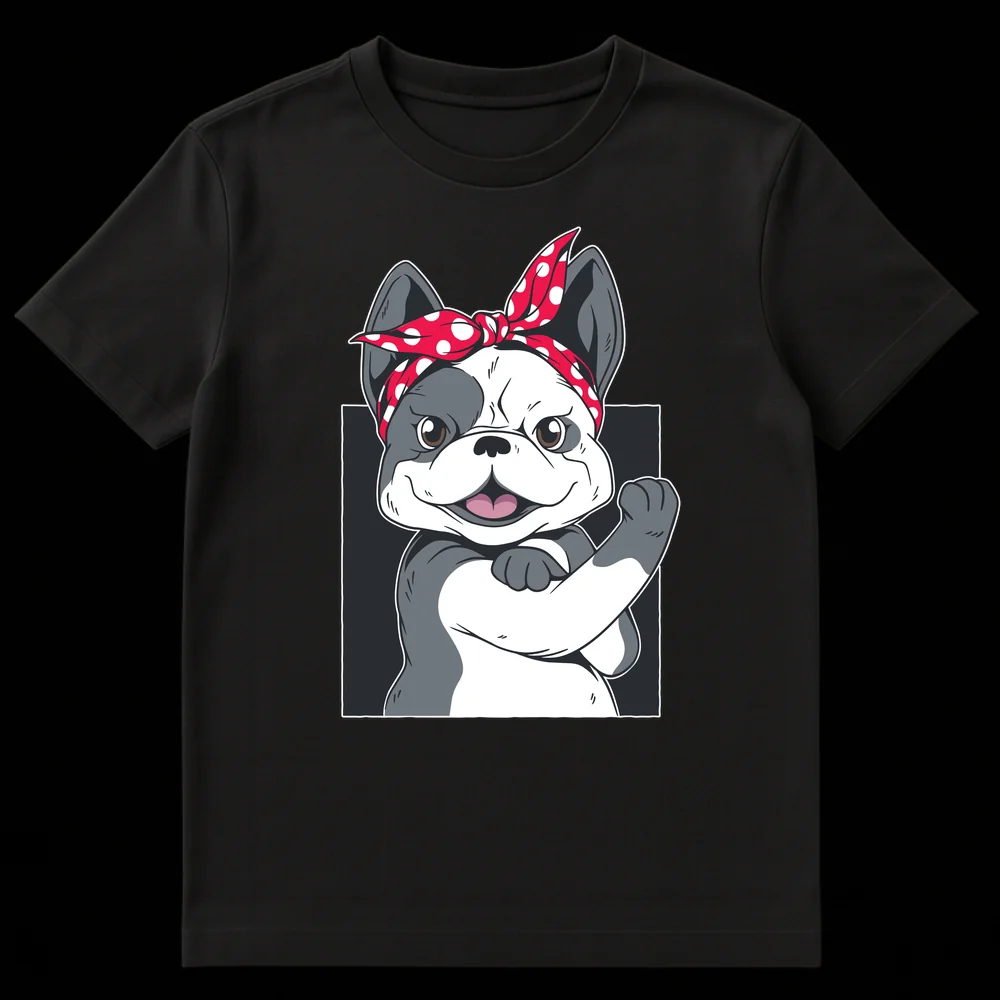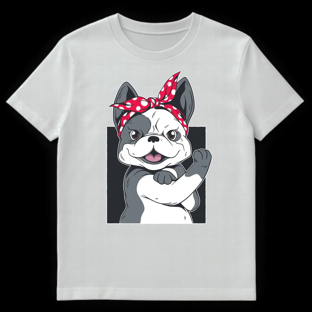 Embrace the ‘can-do’ spirit with our adorable Rosie the Riveter dog design! Featuring a confident Boston Terrier or French Bulldog puppy flexing in a red polka dot bandana, this shirt symbolizes strength and resilience in the cutest package. It’s the perfect empowering gift for dog moms, feminist allies, or anyone who loves their pets and believes in tackling challenges with a smile.