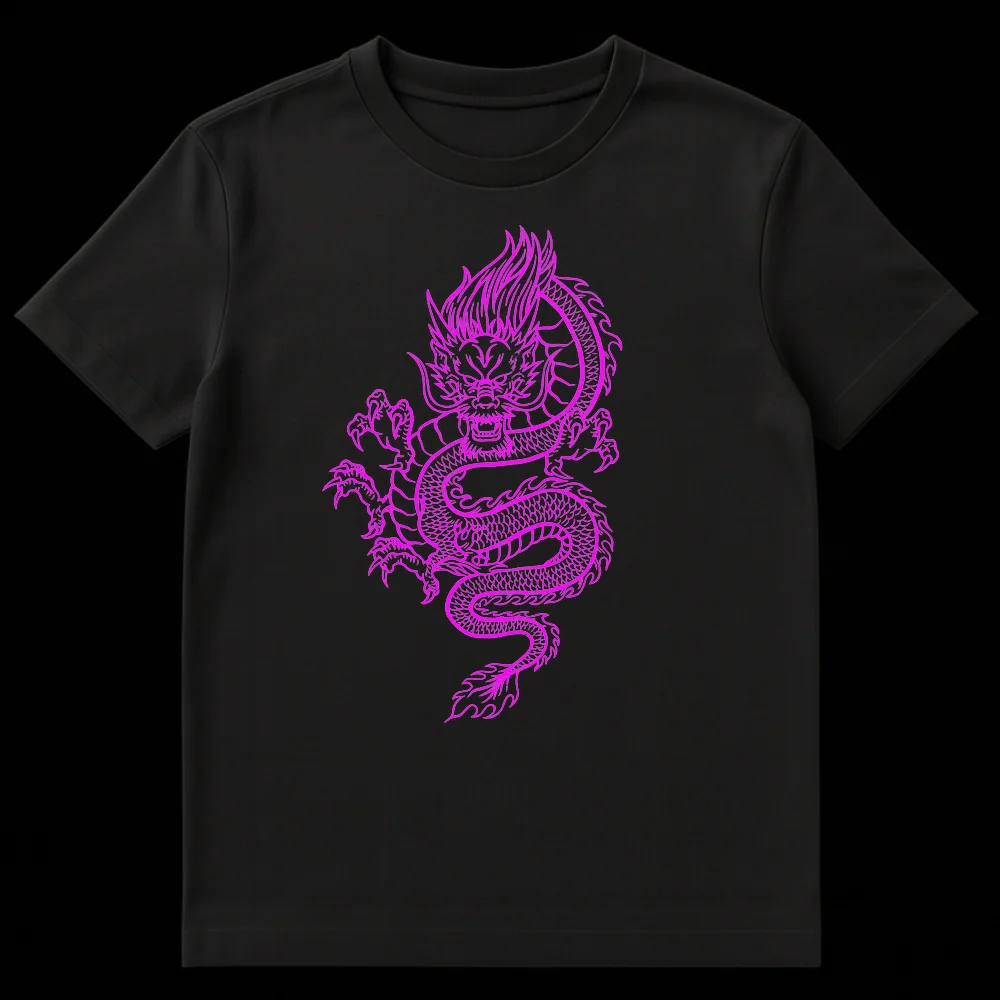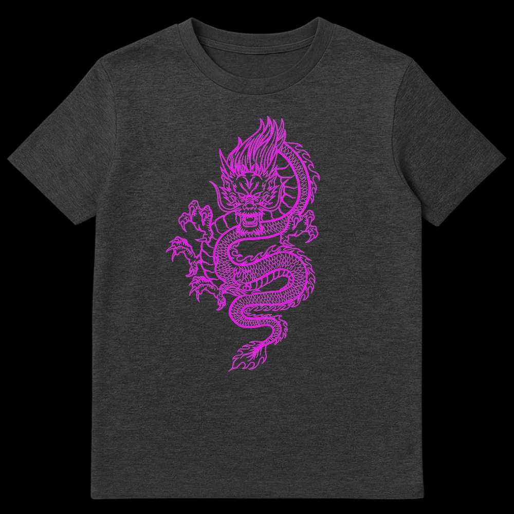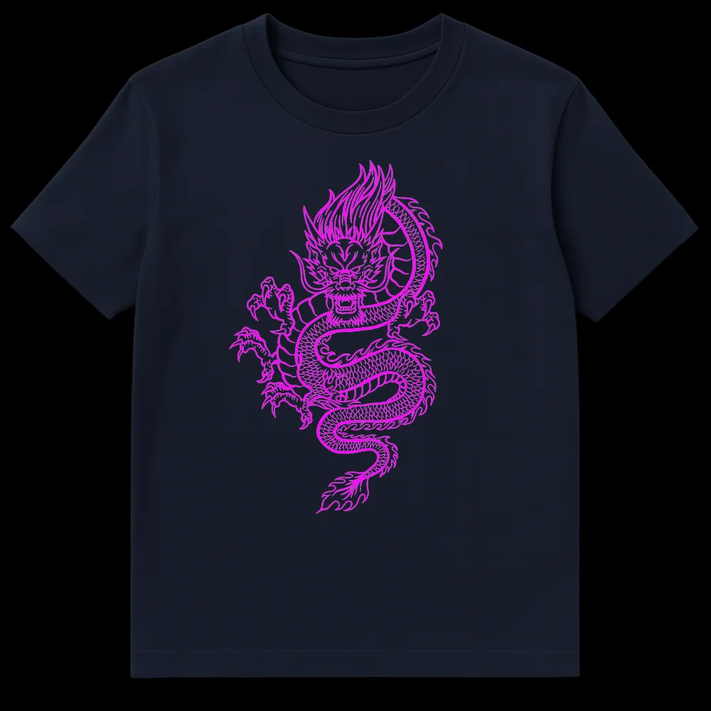 Embrace the legendary power and mystique with our Electric Magenta Dragon T-Shirt. This design captivates with a fierce yet majestic Asian dragon, depicted in dynamic, coiled line art that seems to glow in vibrant fuchsia. The dragon’s intricate details and powerful stance are highlighted against the stark black backdrop, making for a high-contrast visual that truly pops. It’s more than just a shirt; it’s a wearable piece of art that blends traditional Asian mythology with a modern, almost neon-like aesthetic, offering a fresh take on an iconic symbol. Perfect for those who love bold graphic tees, this shirt is a superb choice for dragon enthusiasts, fans of Japanese or Chinese culture, anime and manga lovers, or anyone looking to make a unique fashion statement. Give the gift of mythical strength and cutting-edge style to friends, family, or yourself.