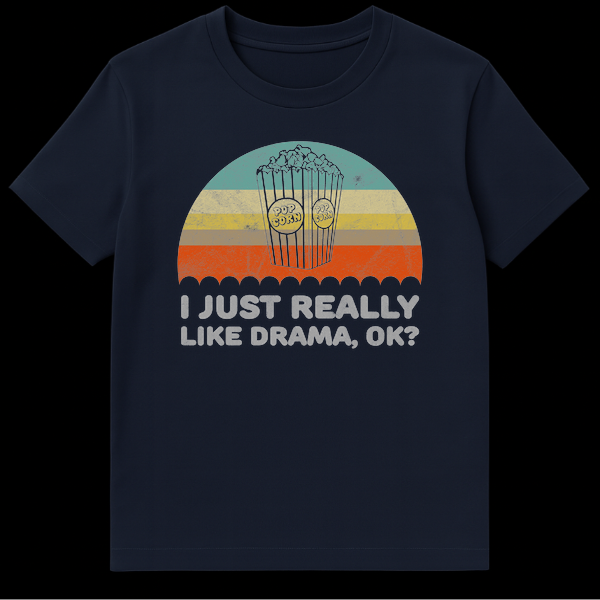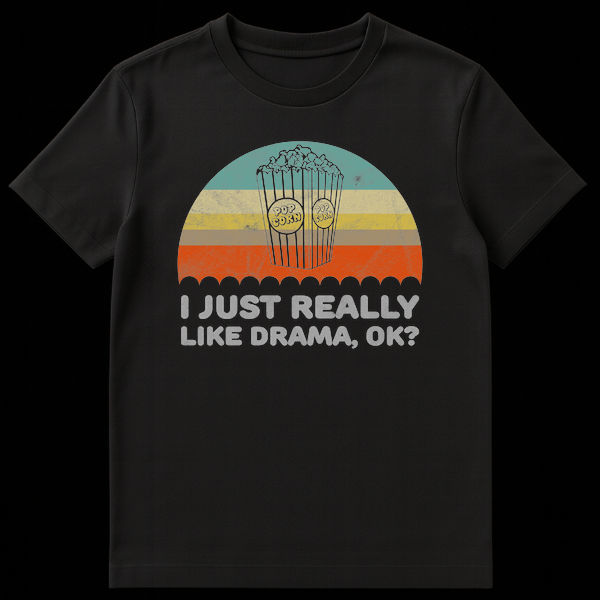 Embrace your love for the dramatic with this retro-inspired tee featuring distressed vintage stripes and iconic popcorn buckets. The bold text “I JUST REALLY LIKE DRAMA, OK?” perfectly captures the humor of enjoying life’s theatrics and cinematic tales. This unique design is an ideal gift for movie buffs, film fanatics, or anyone who appreciates a good story.