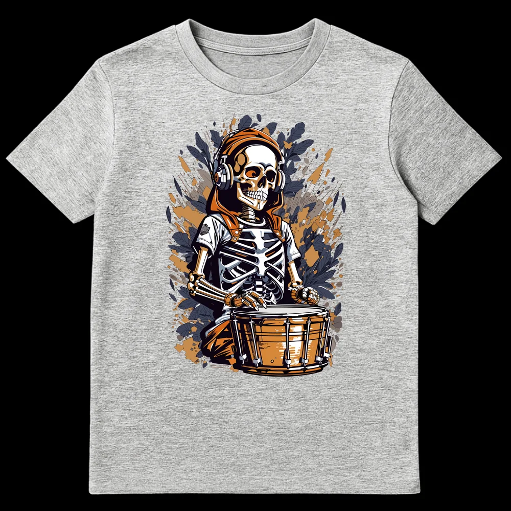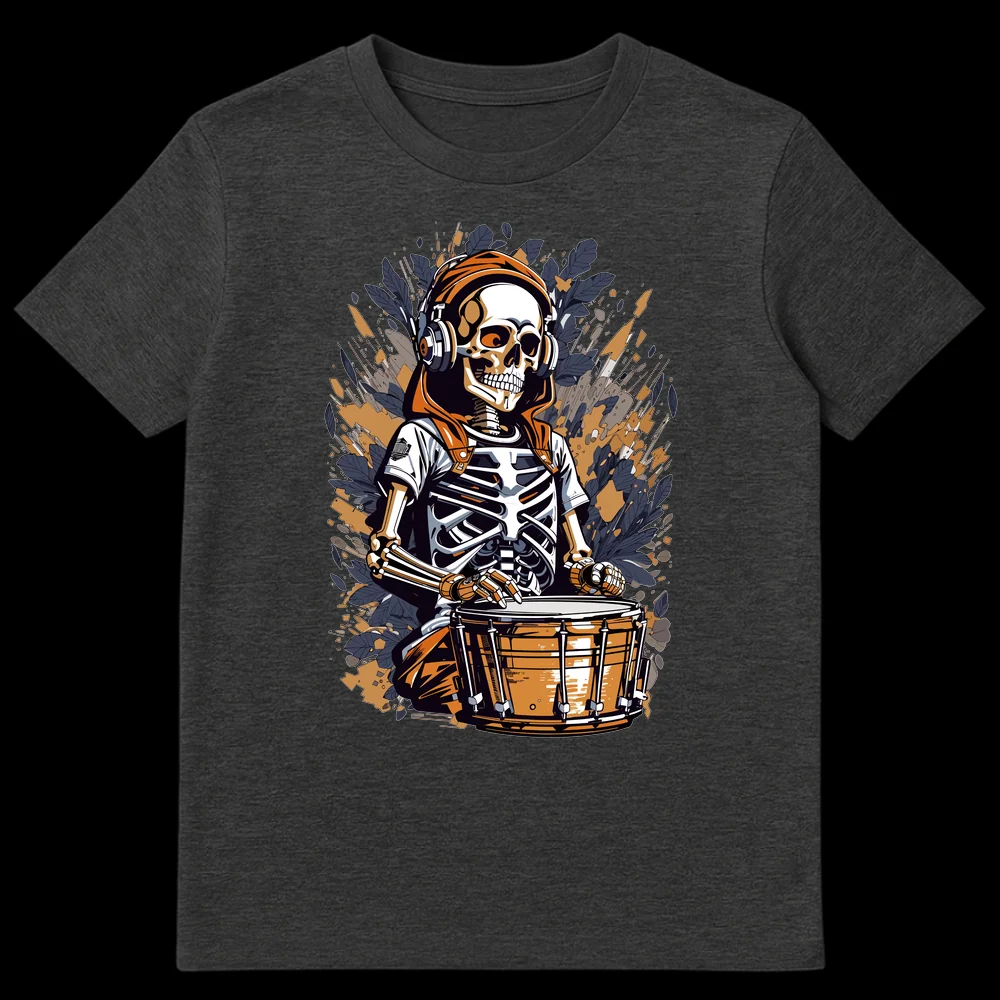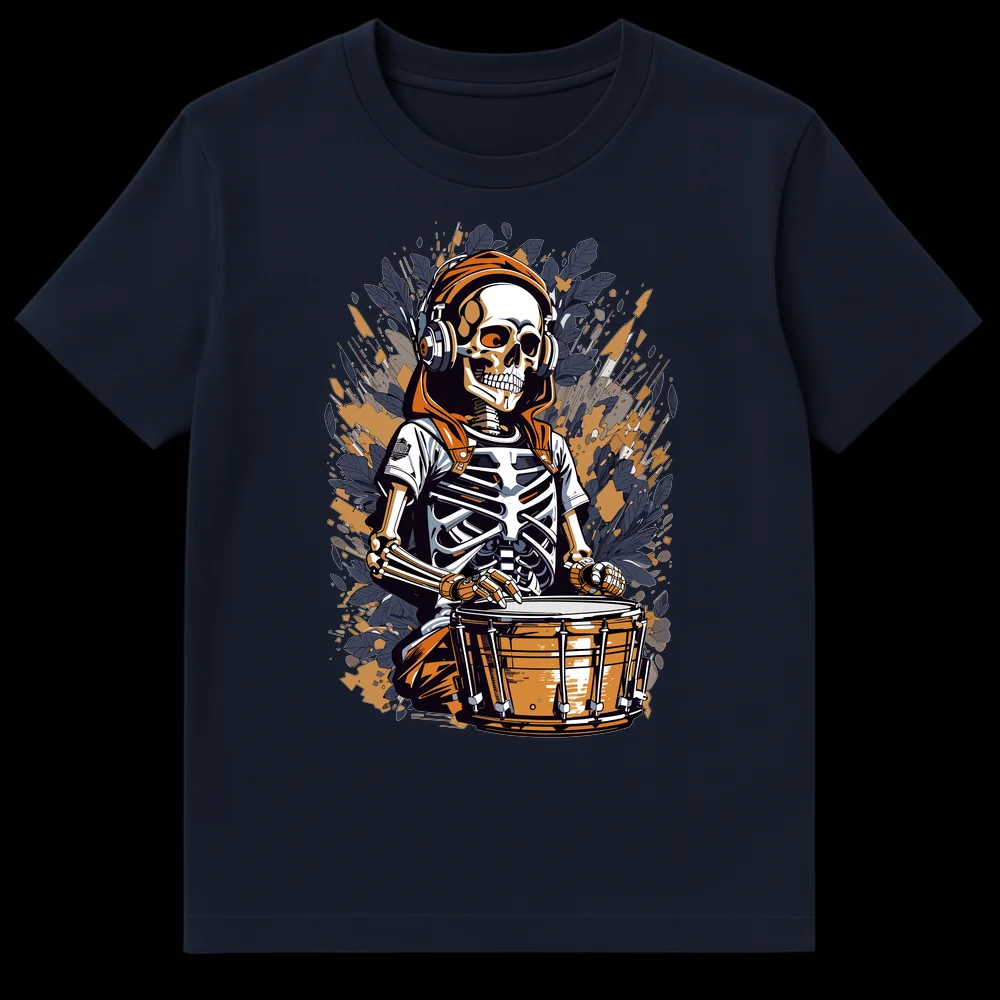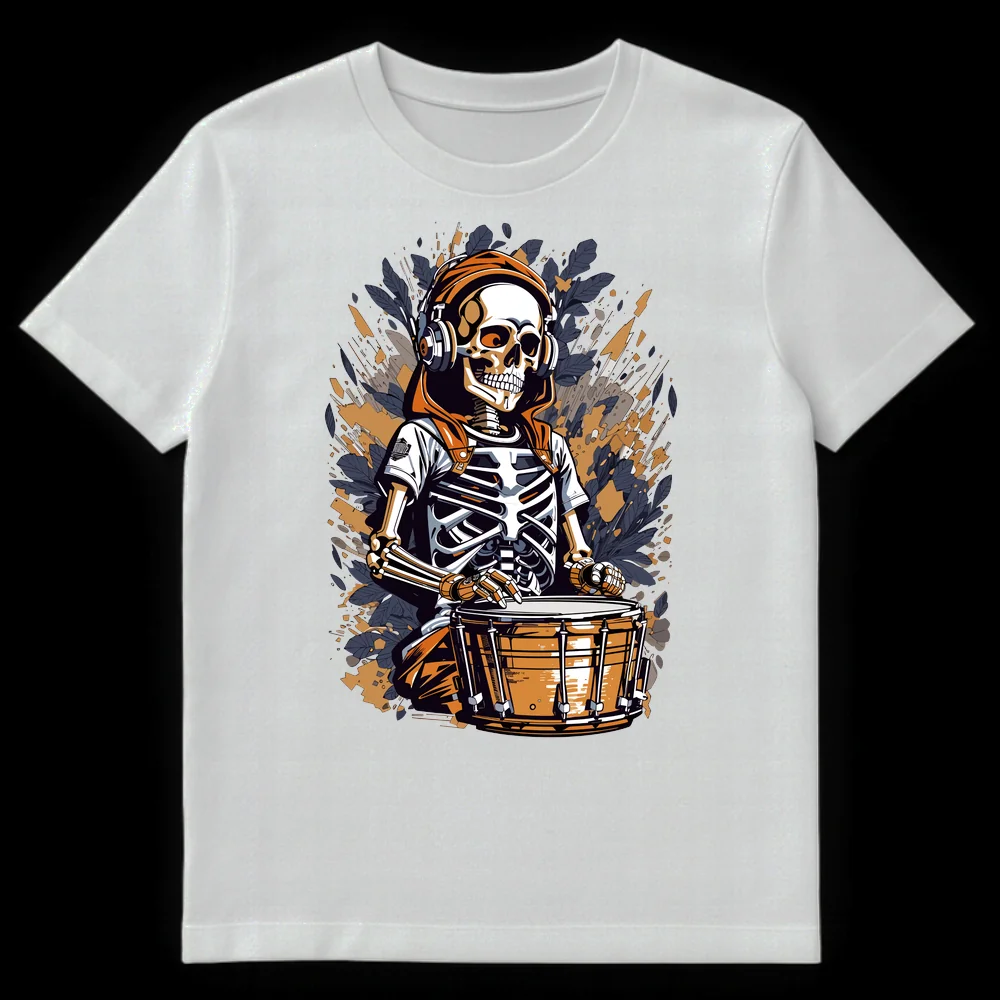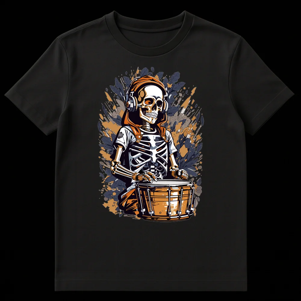 Embrace the beat beyond the grave with our exclusive Skeleton Drummer t-shirt! This captivating graphic showcases a stylized skeleton, vibing in a hoodie and over-ear headphones, intensely focused on his snare drum. The design’s modern graphic illustration, sharp lines, and dynamic background give it a gritty street art and comic book aesthetic, making it an instant head-turner. There’s no text needed; the image speaks volumes about an ‘undying’ passion for music and drumming. With its cool, edgy appeal and subtle rebellious humor, this tee is a must-have for drummers, rock and metal fans, electronic music lovers, or anyone drawn to alternative and urban styles. Gift it to the music fanatic in your life who plays until they drop, or to anyone who wants to wear their passion for rhythm on their sleeve.
