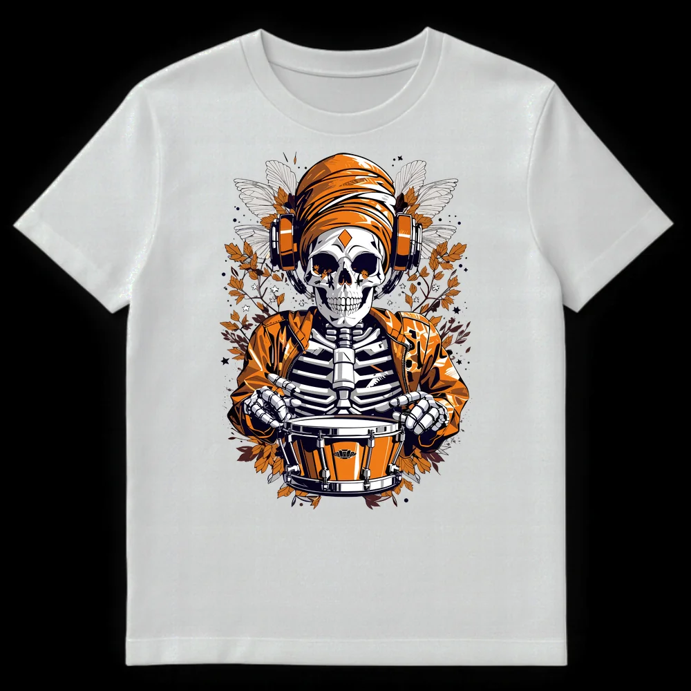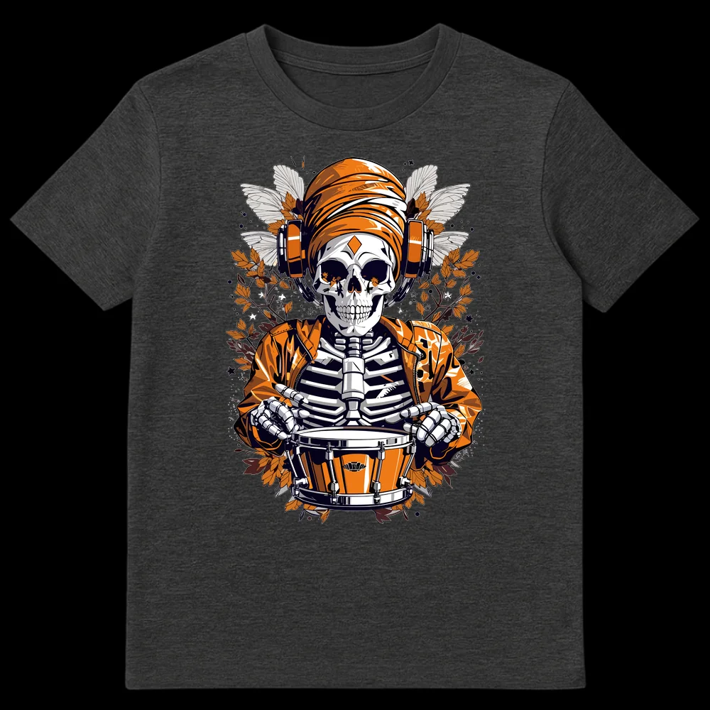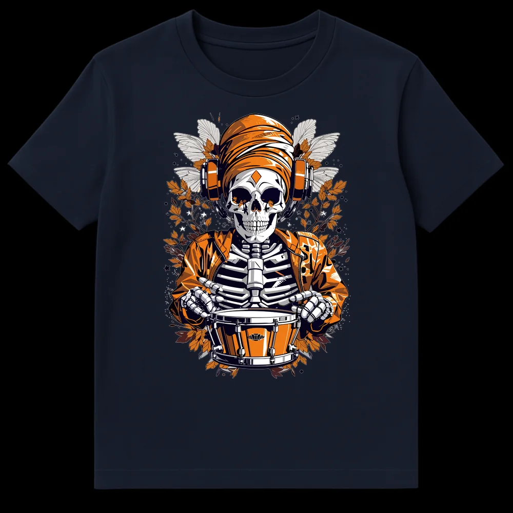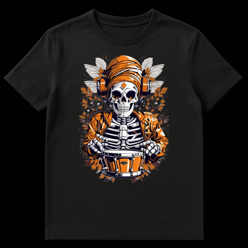Embrace the beat beyond the grave with our striking Drummer Skeleton Musician T-Shirt. This original design showcases a vibrant, orange-clad skeleton, complete with a bomber jacket and turban, fully immersed in playing a snare drum while sporting modern headphones. The intricate details of moth wings and autumnal branches create a rich, dark fantasy atmosphere, contrasting beautifully with the skeleton’s lively musical pursuit. It’s more than just a tee; it’s an attitude, a fusion of macabre cool and rhythmic passion. Perfect for drummers, DJs, electronic music fans, or anyone who loves unique streetwear with a bold, artistic edge. Gift this to a music enthusiast who appreciates individuality and a design that truly stands out.