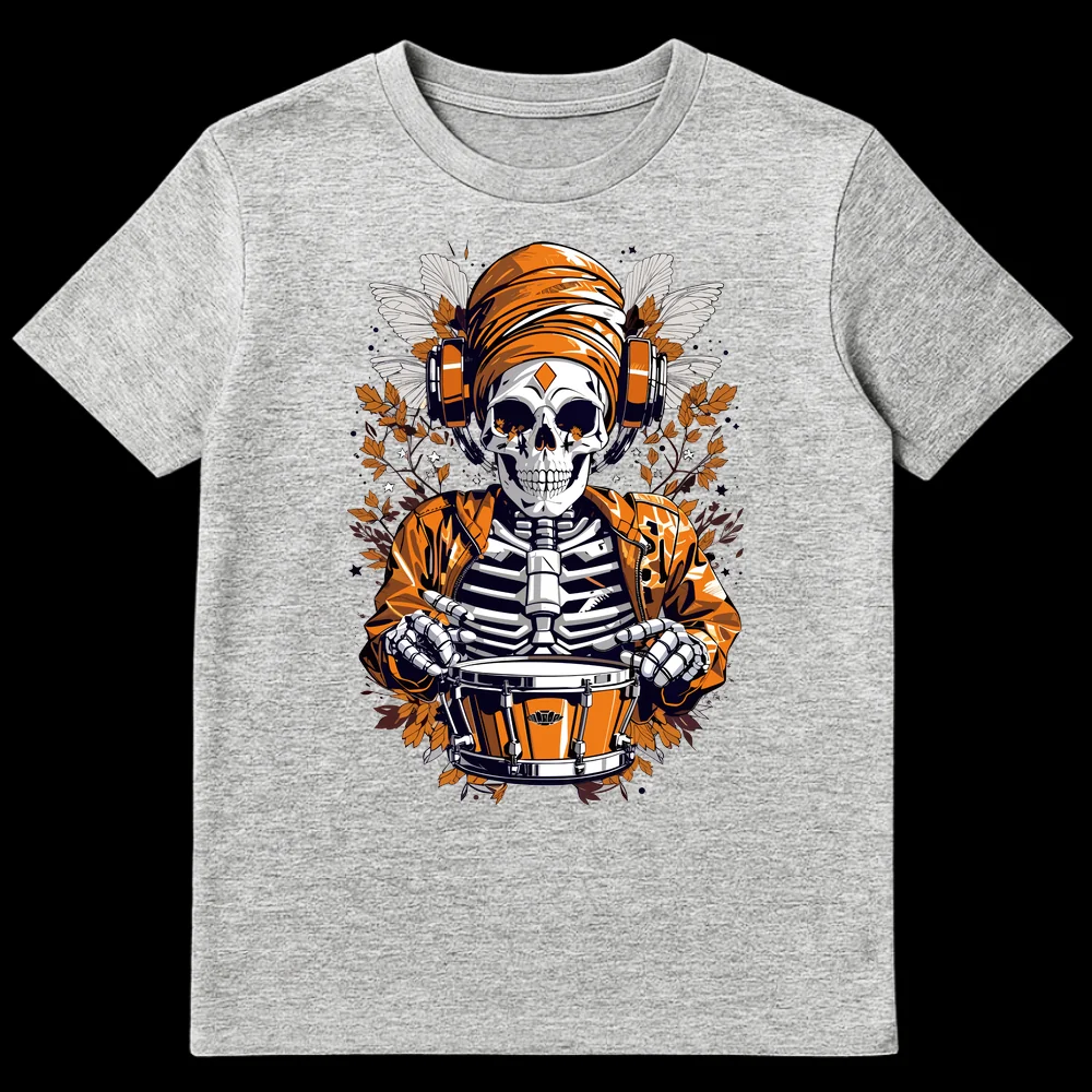 Unleash your passion for rhythm with our unique Drummer Skeleton T-Shirt. This design features a cool, headphone-wearing skeleton playing a snare drum, flanked by elegant moth wings and autumn leaves. It’s a statement piece for music lovers and those with an edgy, alternative style, making it a perfect gift for drummers, DJs, and streetwear enthusiasts.