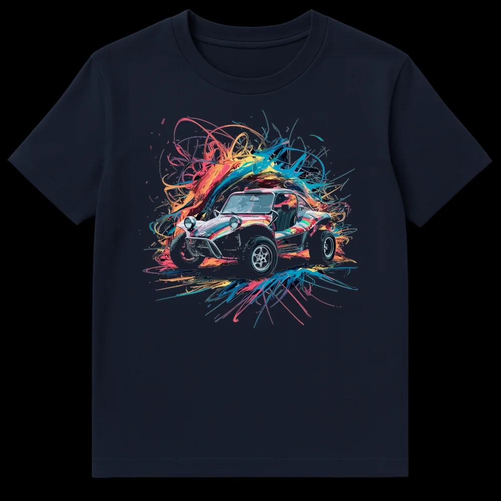 Unleash your adventurous spirit with our vibrant Dune Buggy T-shirt. This eye-catching design features a classic dune buggy surrounded by an explosion of neon paint splatters and energetic streaks, set against a deep black background. It’s the perfect statement piece for off-road enthusiasts and anyone who loves bold, colorful automotive art, making it an excellent gift for adventure seekers.