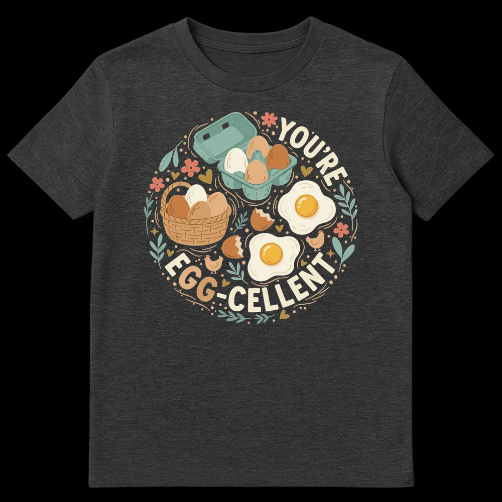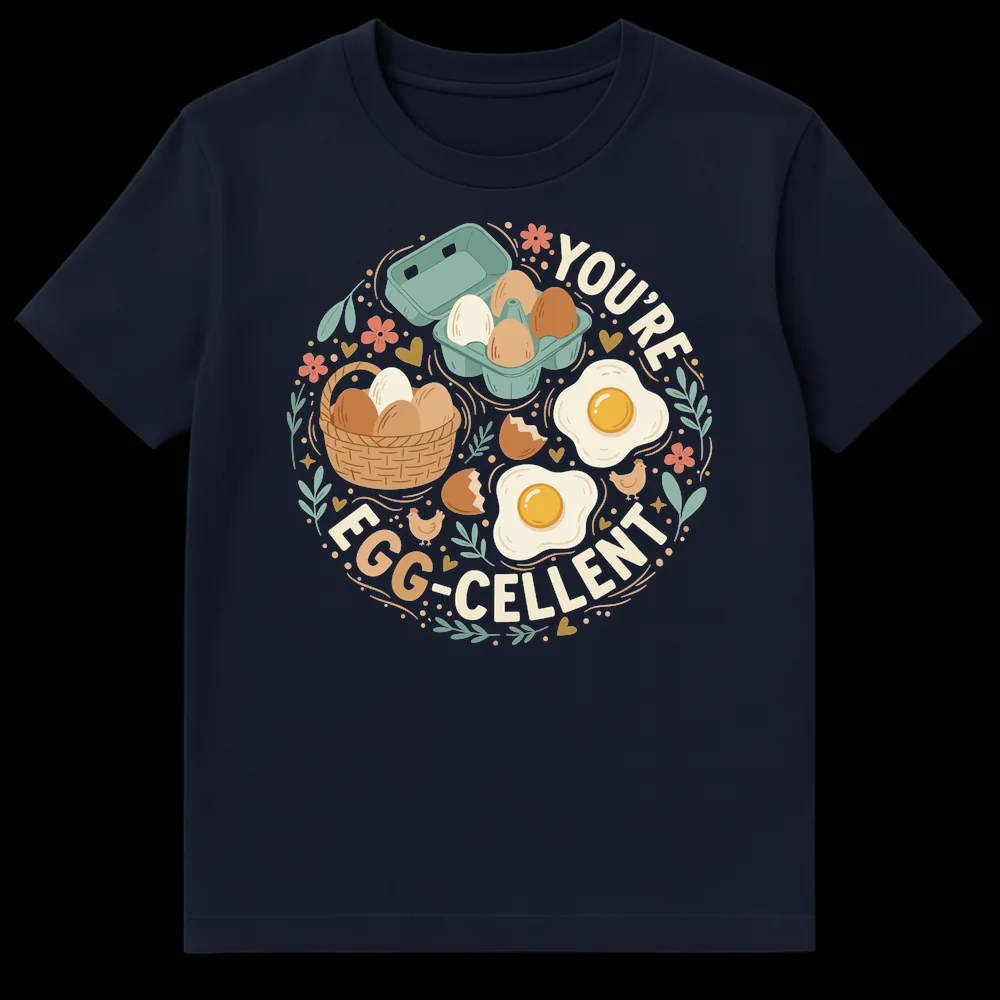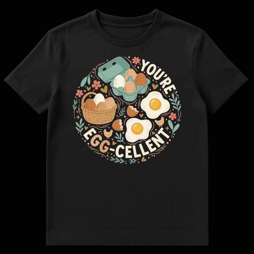 Celebrate the joy of breakfast with our “YOU’RE EGG-CELLENT” t-shirt, featuring adorable cartoon eggs, charming chickens, and delightful floral accents. This design is a clever pun on “You’re Excellent,” making it a wholesome and lighthearted way to spread positivity. Perfect for foodies, brunch lovers, or anyone who appreciates a good pun and a touch of rustic charm.