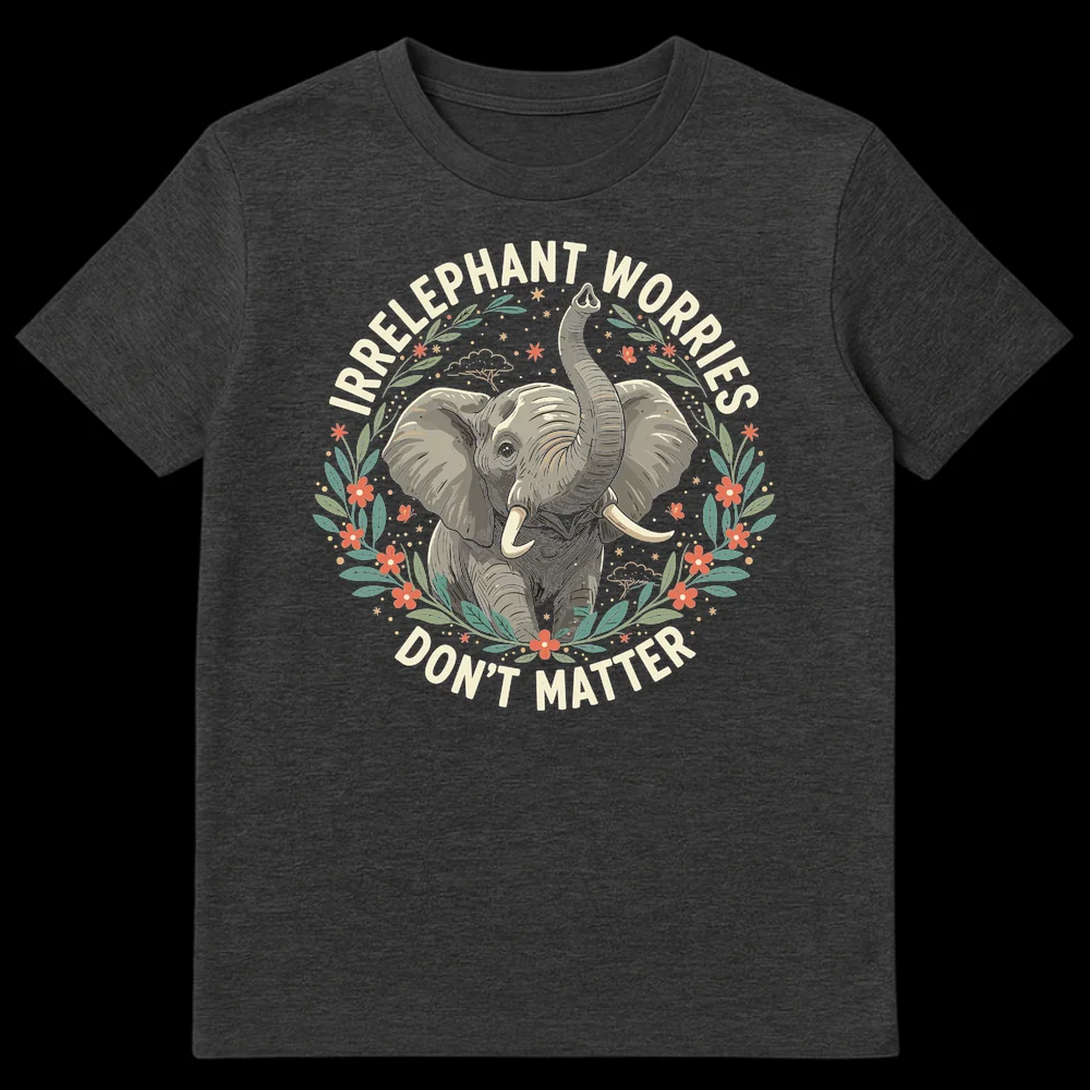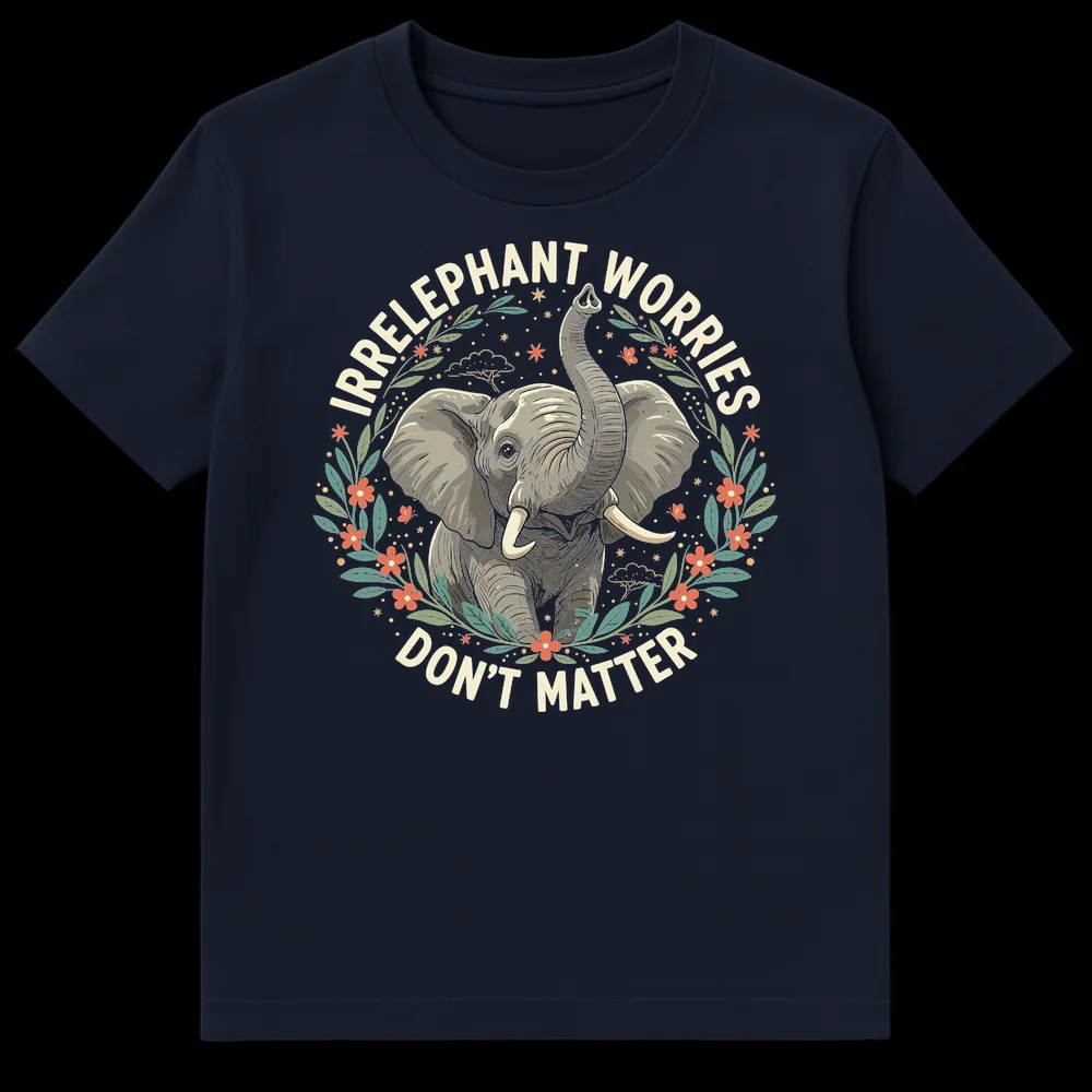 Tags: Calm vibes shirt, Elephant worries, Irrelephant shirt, Mental wellness tee, Nature animal shirt, Positive message elephant, Punny elephant shirt, Stress relief apparel