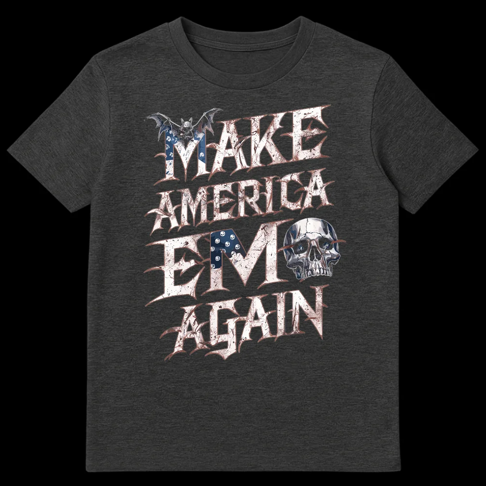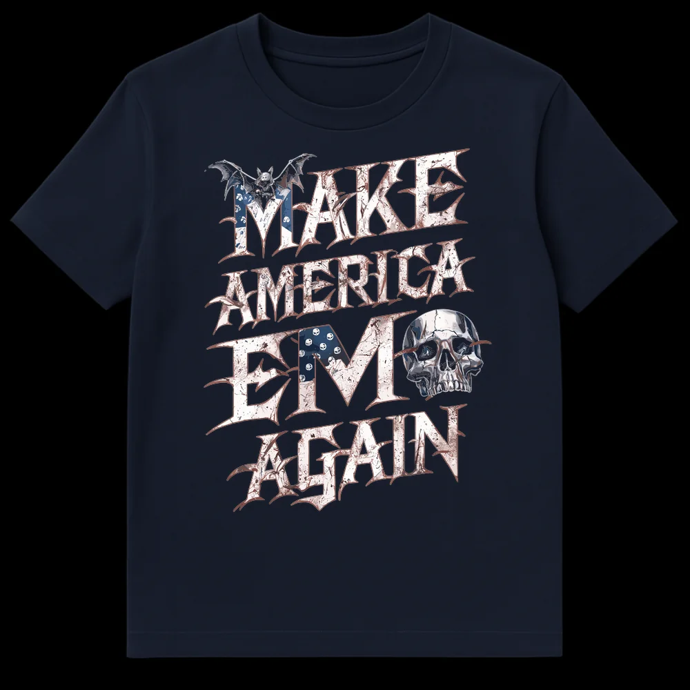 Embrace nostalgic irony with the “Make America Emo Again” t-shirt. This design cleverly parodies a famous political slogan, transforming it into a witty statement for emo culture enthusiasts. Featuring gothic-inspired text, a bat, and a skull, it celebrates the emo subculture with a unique blend of humor and dark aesthetic. Perfect for anyone who appreciates alternative music, counter-culture humor, or a good satirical jab.