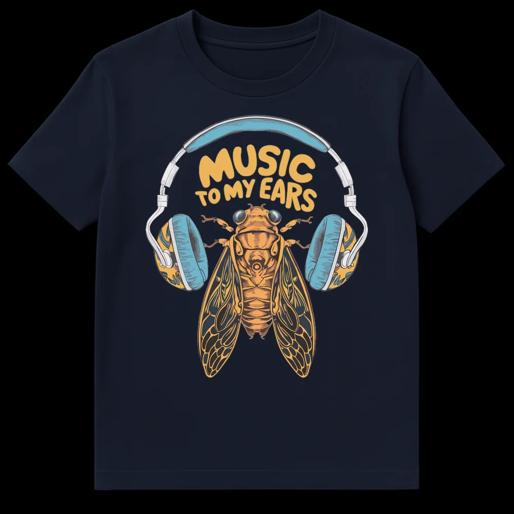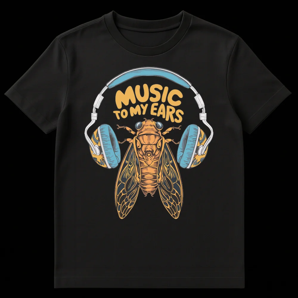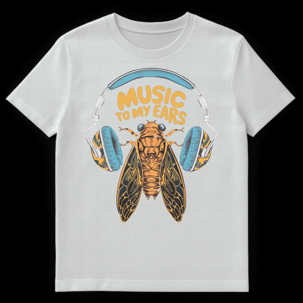 Celebrate nature’s loudest musician with our unique “MUSIC TO MY EARS” t-shirt. This clever design features a detailed cicada wearing over-ear headphones, perfectly playing on the classic idiom and the insect’s iconic song. It’s an ideal gift for nature lovers, entomology fans, music enthusiasts, or anyone who appreciates a witty visual pun.