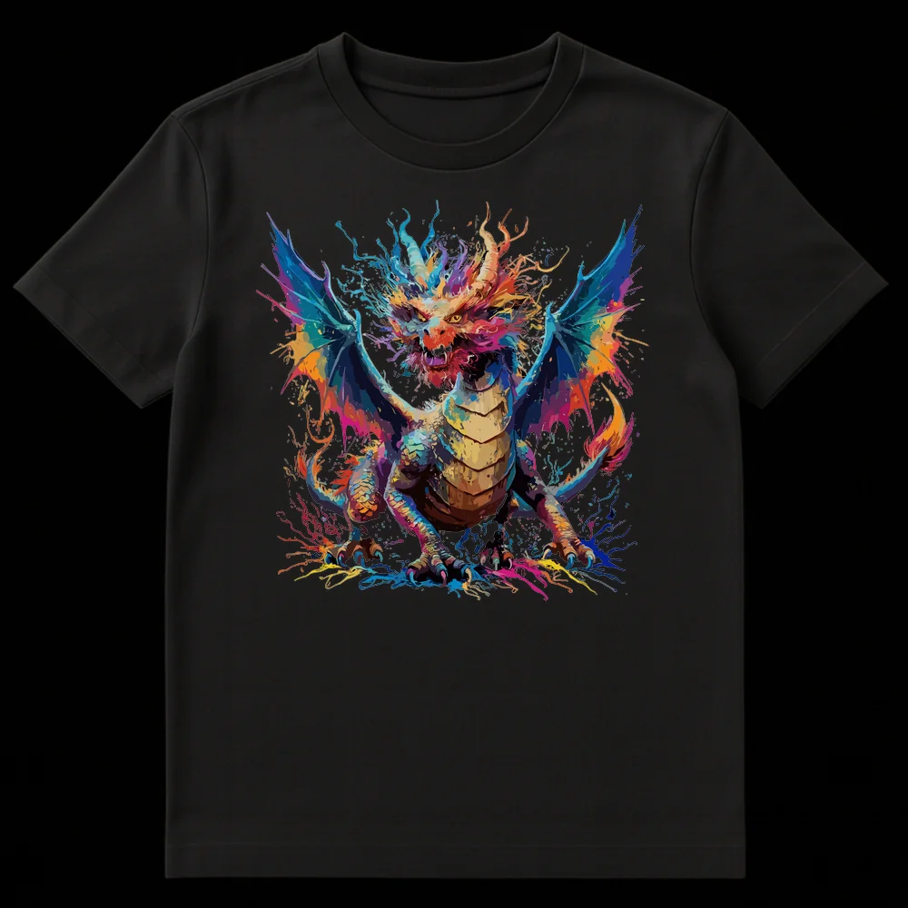 Ignite your style with our mesmerizing Roaring Splatter Dragon t-shirt, a true masterpiece for fantasy enthusiasts and art aficionados alike. This design brilliantly captures a powerful dragon mid-roar, its form crafted from an explosion of highly saturated, multi-chromatic paint splashes. Vibrant blues, fiery reds, electric pinks, and sunny yellows erupt against the stark black canvas, making the creature pop with dramatic intensity and untamed energy. It’s more than just a shirt; it’s a wearable piece of abstract expressionism that celebrates the raw power and vivid imagination of mythical lore. This tee is an ideal gift for anyone who loves high fantasy, Dungeons & Dragons, or simply seeks to express their unique personality through bold, artistic apparel. Command attention and showcase your passion for legendary creatures with this visually striking, awe-inspiring design.