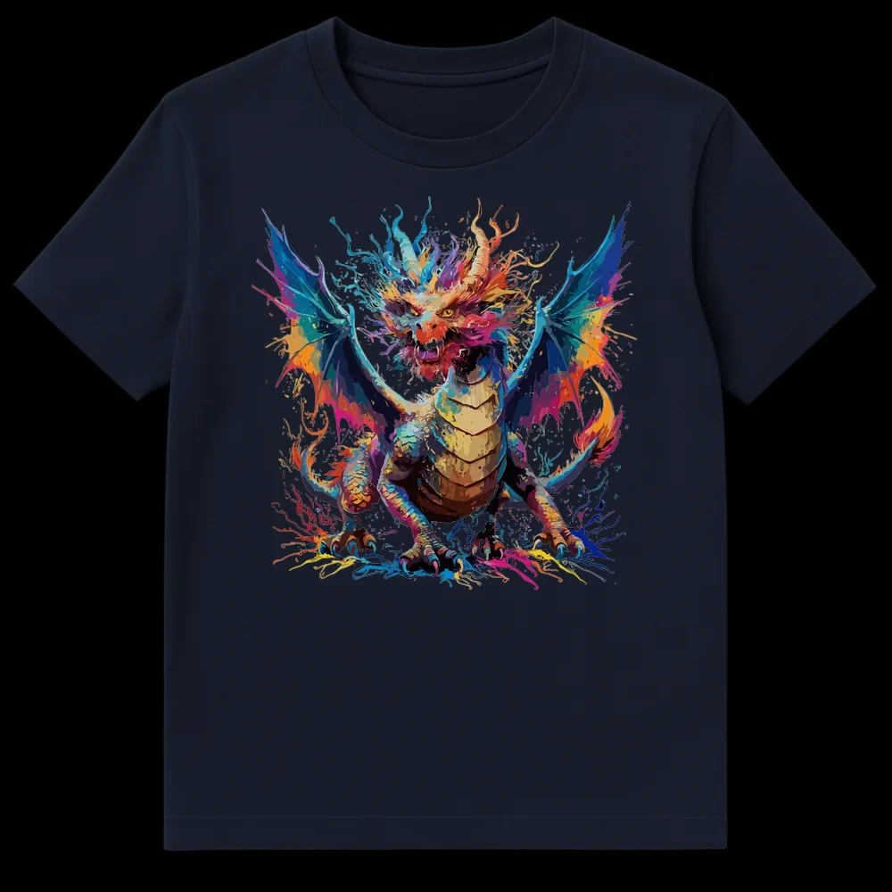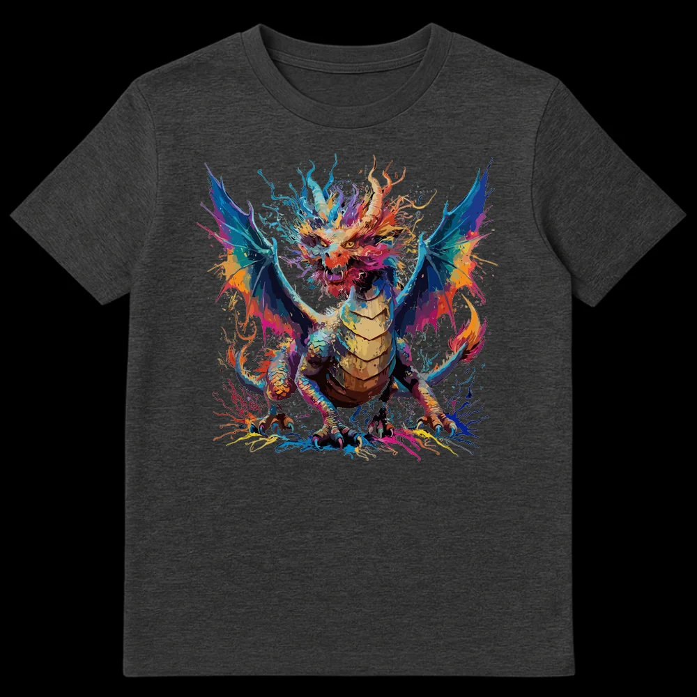 Unleash your inner beast with this captivating t-shirt featuring a majestic dragon rendered in an explosive, vibrant splatter art style. The fiery creature, formed from a chaotic burst of color, stands poised to roar, its powerful presence making a bold statement. Perfect for fantasy fans and art lovers who appreciate unique, expressive designs, this tee makes an excellent gift for anyone drawn to mythical creatures and dynamic artwork.