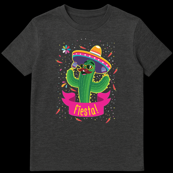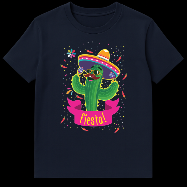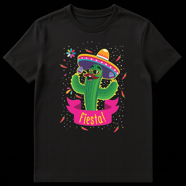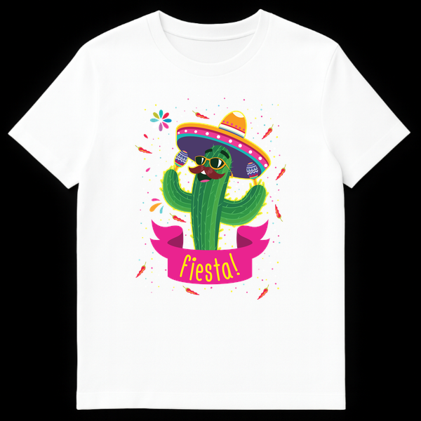 Get ready to party with our spectacular ‘Fiesta!’ t-shirt, a visual explosion of joy and color! The central character is a hilariously cool, mustachioed cactus, complete with stylish sunglasses, a traditional sombrero, and maracas, embodying pure party energy. Set against a dark, dynamic background filled with confetti, chili peppers, and vibrant splashes, this design is a direct invitation to celebrate. It’s a fantastic way to express your love for Mexican culture, Cinco de Mayo festivities, or any lively gathering. This tee isn’t just clothing; it’s a mood, a statement, and a guaranteed smile-generator. Perfect for party hosts, event-goers, or anyone with a vibrant spirit, this t-shirt makes an excellent gift for friends and family who love fun, unique apparel and festive themes.