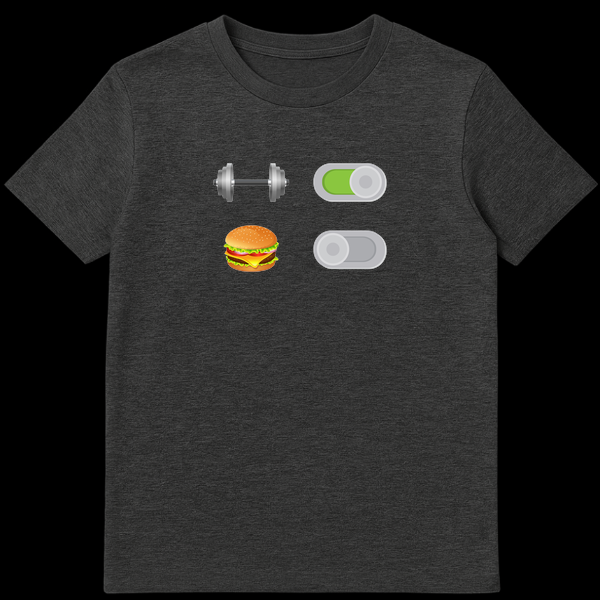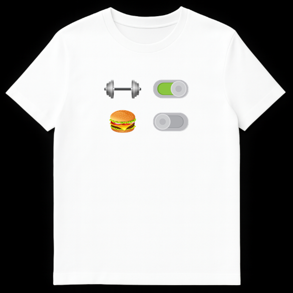 Switch your lifestyle settings with this clever gym humor tee featuring a minimalist toggle interface. The design shows a dumbbell switched ‘ON’ and a burger switched ‘OFF,’ perfectly capturing the dedication required for fitness. It’s the ideal motivational gift for personal trainers, bodybuilders, and anyone committed to their workout journey.