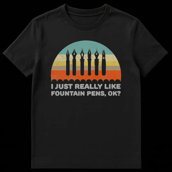 Embrace your passion for classic writing instruments with our distinctive “I JUST REALLY LIKE FOUNTAIN PENS, OK?” t-shirt. This design captures a nostalgic spirit with its retro, distressed aesthetic, showcasing iconic fountain pen nibs silhouetted against a vintage-striped background. The text, rendered in a bold, weathered font, speaks directly to anyone who truly understands the joy and unique appeal of fountain pens. It’s a fun, slightly whimsical statement that proudly expresses your dedication to this timeless craft. Whether you’re a seasoned collector, an avid writer, or simply admire the elegance of a well-crafted pen, this shirt is a perfect fit. It makes an excellent gift for birthdays, holidays, or any occasion for the fountain pen enthusiast in your life who isn’t afraid to show their ink-stained heart.
